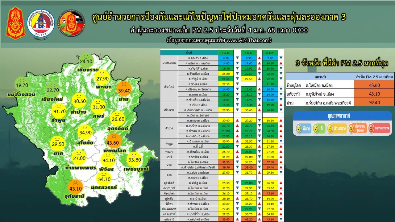 ด้าน ศอ.ปกป.ภาค 3 รายงานการติดตามสถานการณ์ไฟป่าหมอกควันและฝุ่นละอองในพื้นที่ 17 จว.ภาคเหนือ ค่าเฉลี่ยสะสม ประจำวันที่ 4 ม.ค. 68 เวลา 07.00 น. ดังนี้