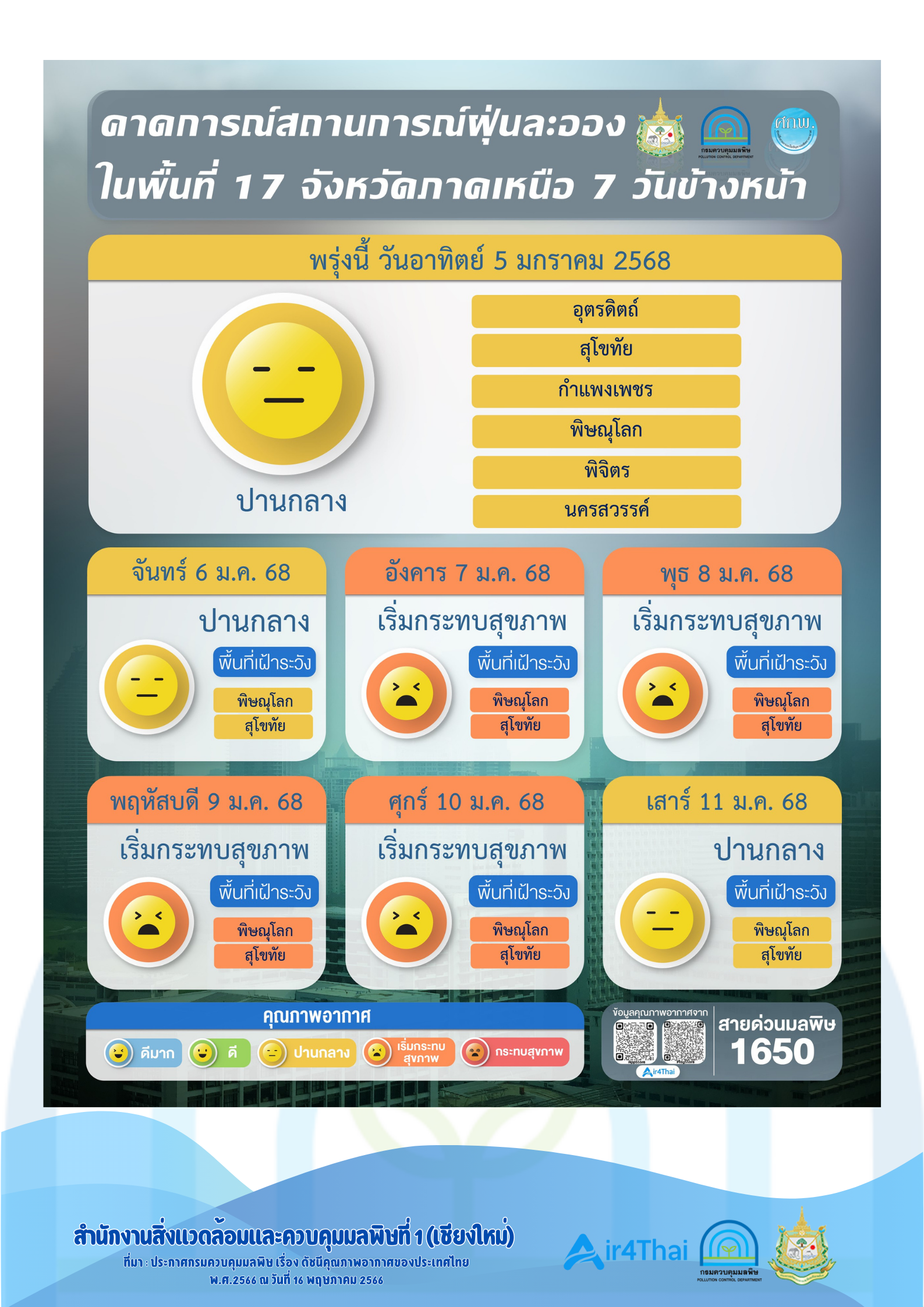 📢 สรุปสถานการณ์ฝุ่น PM2.5 ประจำวันที่ 4 มกราคม 2568 ในพื้นที่รับผิดชอบของสำนักงานสิ่งแวดล้อมและควบคุมมลพิษที่ 1 (เชียงใหม่ เชียงราย ลำพูน แม่ฮ่องสอน)