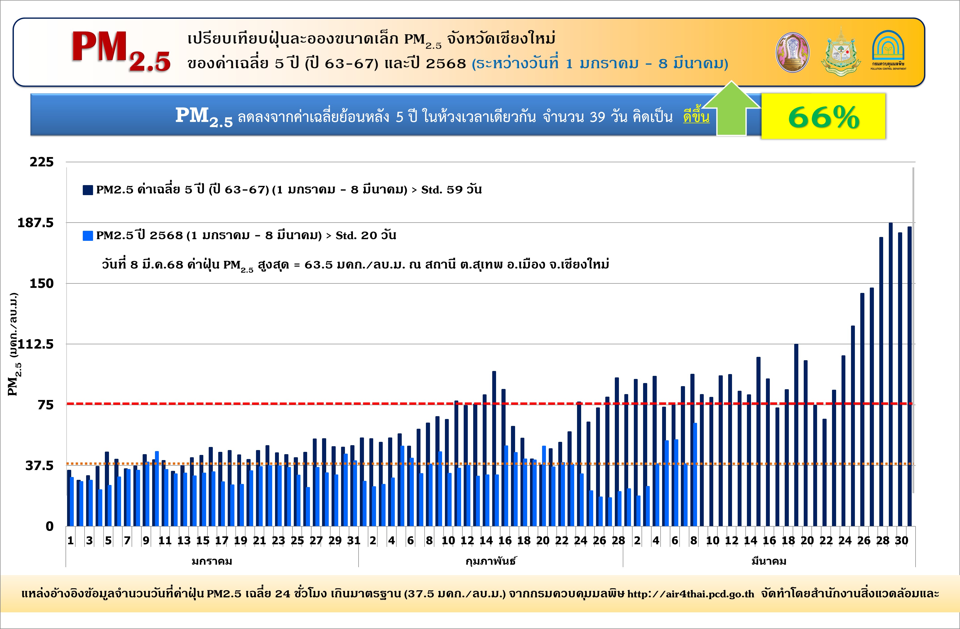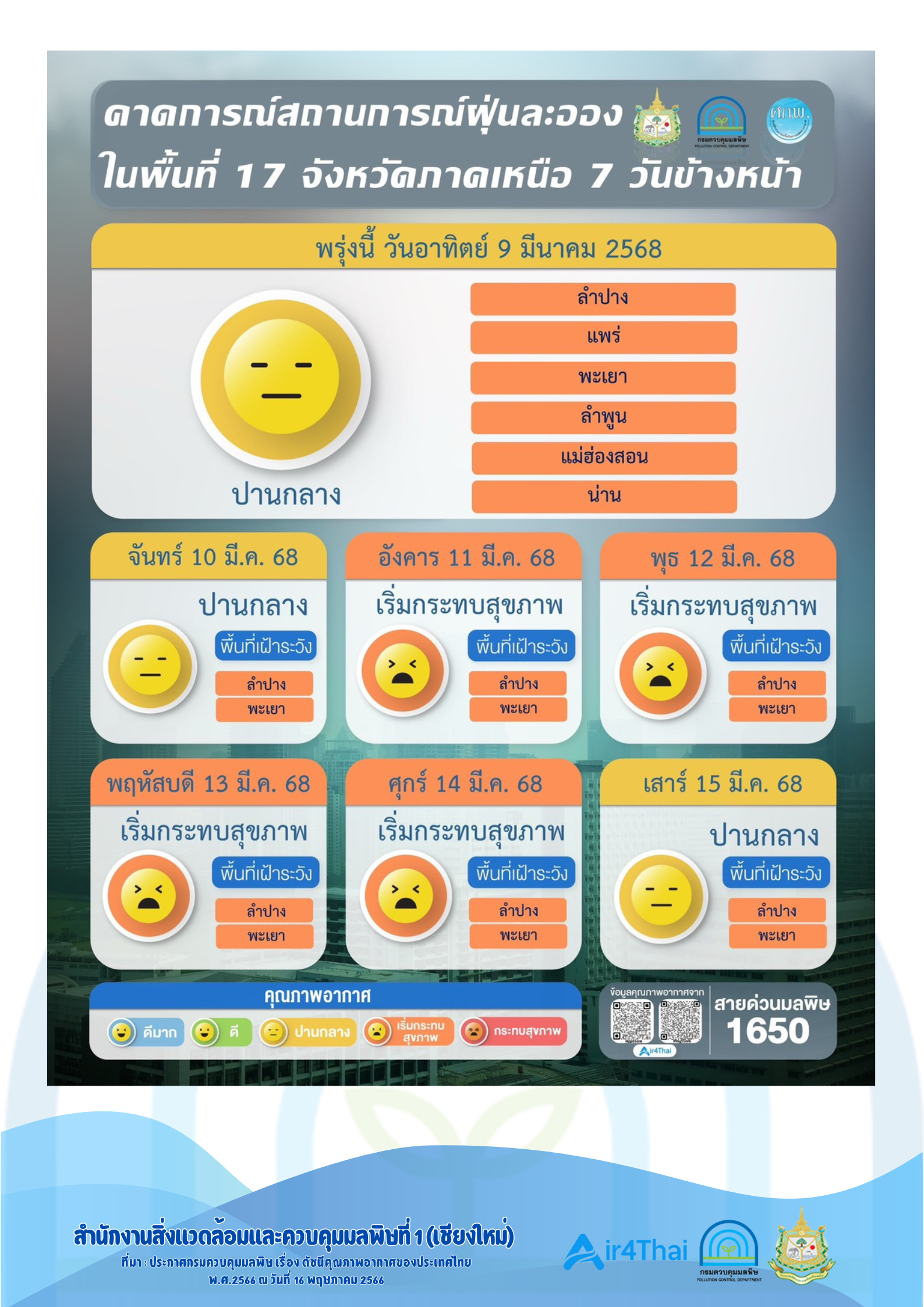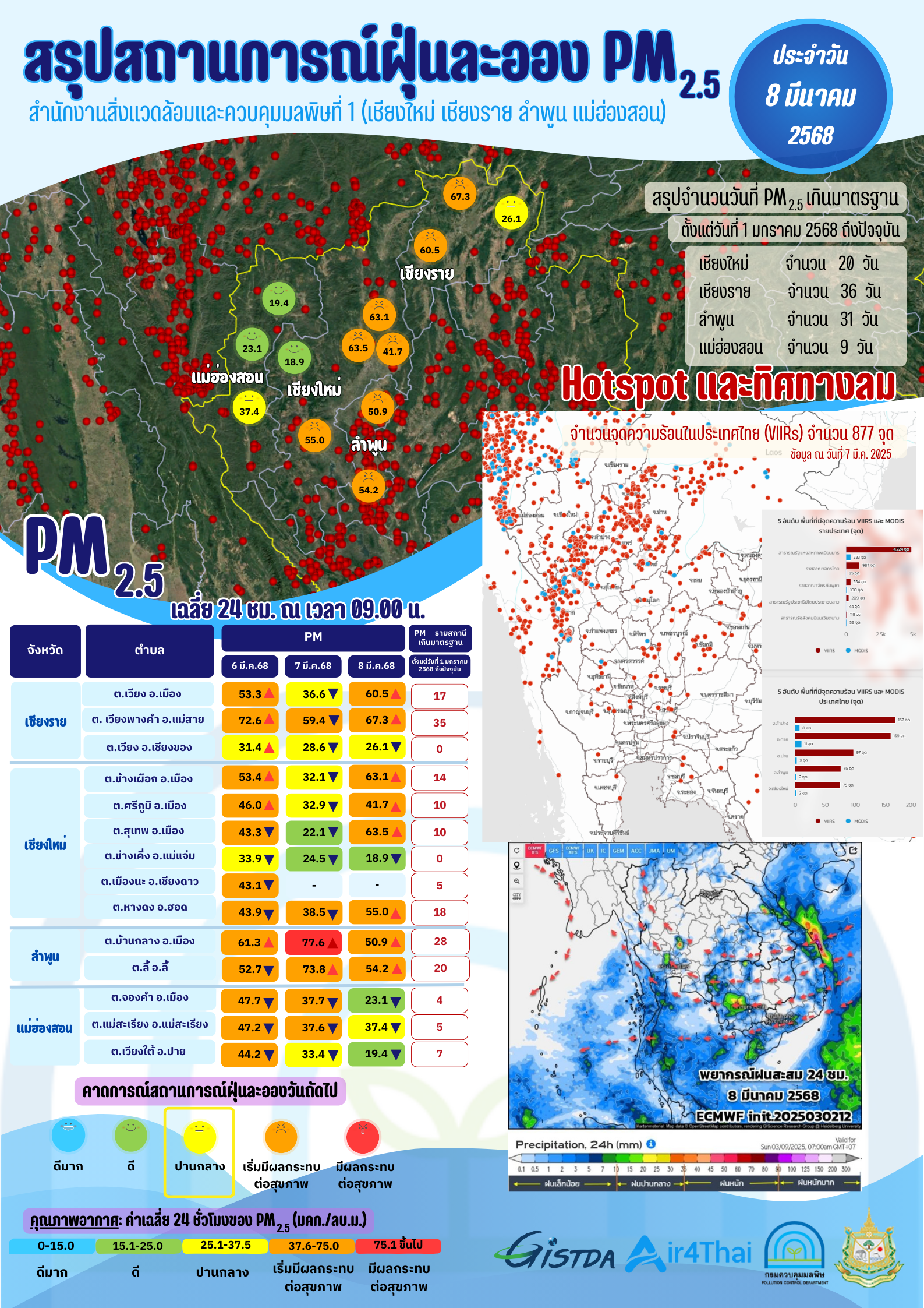 📢 สรุปสถานการณ์ฝุ่น PM2.5 ประจำวันที่ 8 มีนาคม 2568 ในพื้นที่รับผิดชอบของสำนักงานสิ่งแวดล้อมและควบคุมมลพิษที่ 1 (เชียงใหม่ เชียงราย ลำพูน แม่ฮ่องสอน)