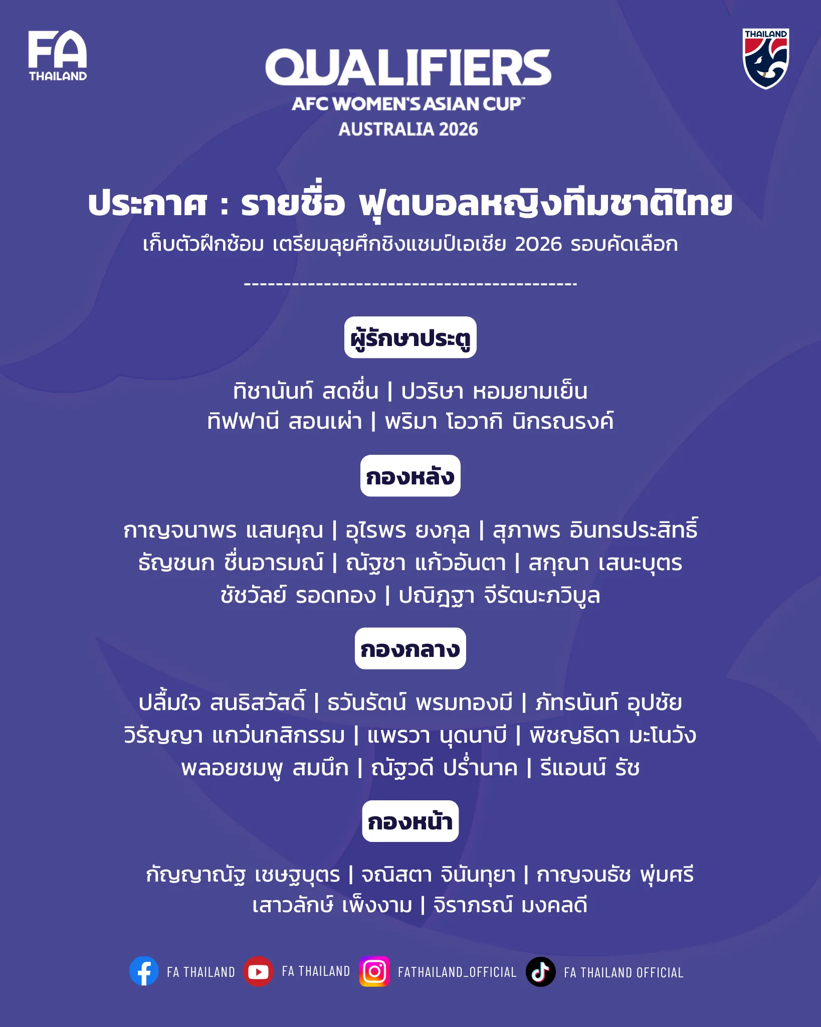 สมาคมกีฬาฟุตบอลแห่งประเทศไทย ในพระบรมราชูปถัมภ์ ประกาศรายชื่อ 26 นักฟุตบอลหญิงทีมชาติไทย เก็บตัวฝึกซ้อม เพื่อเตรียมความพร้อมสำหรับการแข่งขัน ฟุตบอลหญิงชิงแชมป์เอเชีย 2026 รอบคัดเลือก (AFC Women’s Asian Cup 2026 Qualifiers) ระหว่างวันที่ 23 มิถุนายน – 5 กรกฎาคม 2568 ณ สนามกีฬาสมโภชเชียงใหม่ 700 ปี จังหวัดเชียงใหม่ ภายใต้การคุมทัพของ “ฟูโตชิ อิเคดะ” หัวหน้าผู้ฝึกสอนชาวญี่ปุ่น