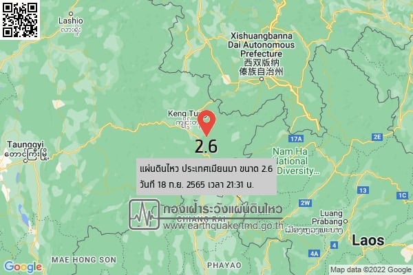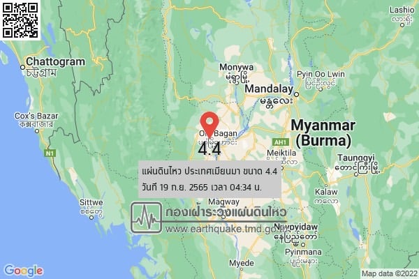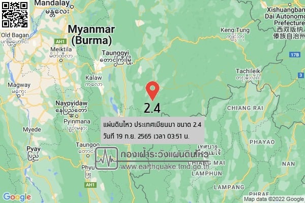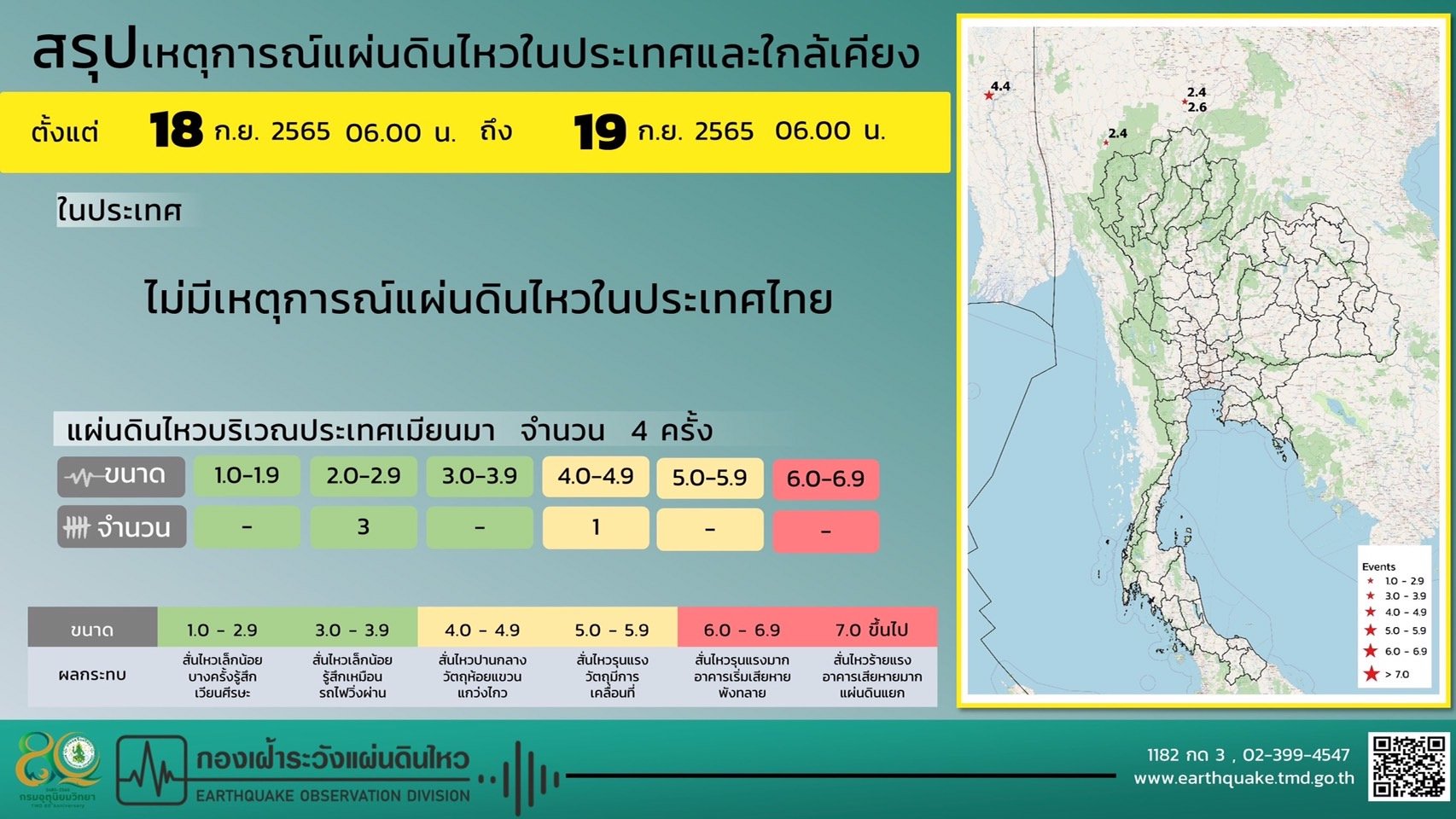 สำหรับสถานการณ์แผ่นดินไหวในประเทศและใกล้เคียงในช่วงวันที่ 18-19 กันยายน 2565 ตรวจพบเหตุการณ์แผ่นดินไหว 2.4-4.4 จำนวน 4 ครั้ง มีศูนย์กลางอยู่ที่ประเทศเมียนมา ได้แก่ ขนาด 2.6 ทางทิศตะวันออกเฉียงเหนือของ อ.แม่สาย จ.เชียงราย ประมาณ 77 กม. ขนาด2.4 ทางทิศตะวันออกเฉียงเหนือของ อ.แม่สาย จ.เชียงราย ประมาณ 78 กม. ขนาด 2.4 ทางทิศตะวันตกเฉียงเหนือของ อ.ปางมะผ้า จ.แม่ฮ่องสอน ประมาณ 73 กม ขนา4.4 ทางทิศตะวันตกเฉียงเหนือของ อ.เมือง จ.แม่ฮ่องสอน ประมาณ 406 กม. ไม่มีผลกระทบต่อประเทศไทยแต่อย่างใด