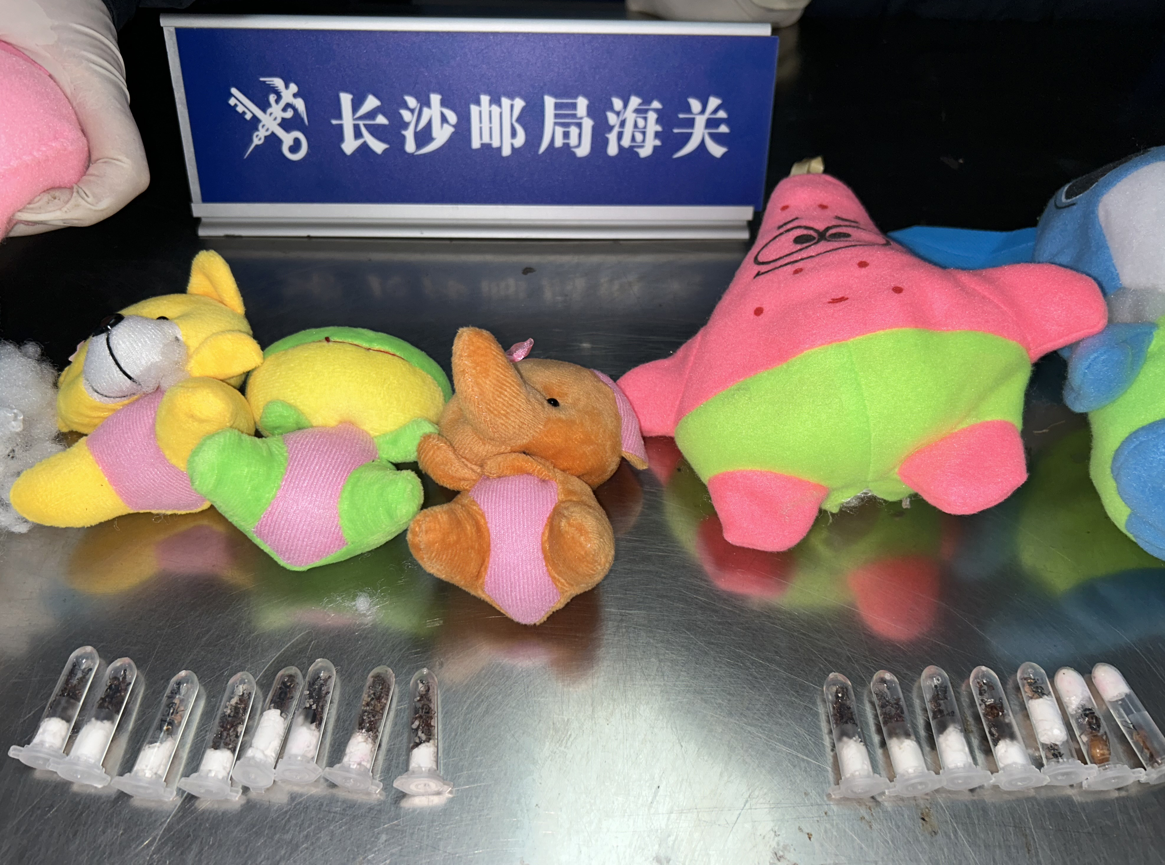 (ภาพจากหน่วยบริการศุลกากรไปรษณีย์ฉางซา : มดมีชีวิตจำนวน 19 หลอดที่ถูกซุกซ่อนในตุ๊กตายัดนุ่น)