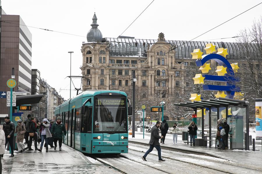 (แฟ้มภาพซินหัว : ประชาชนโดยสารรถรางหลังหิมะตกในนครแฟรงก์เฟิร์ตของเยอรมนี วันที่ 18 ม.ค. 2024)