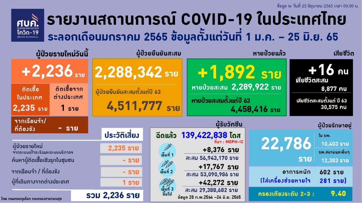 ขณะที่สาธารณสุข แถลงสถานการณ์ตั้งแต่ 1 มกราคม 2565 พบผู้ติดเชื้อโควิด-19 เพิ่ม 2,236 ราย สะสมเป็น 2,288,342 ราย เสียชีวิตเพิ่ม 16 ราย เสียชีวิตสะสม 8,877 ราย หายป่วยวันนี้ 1,892 ราย สะสม 2,289,922 ราย รักษาตัวอยู่ 22,786 ราย