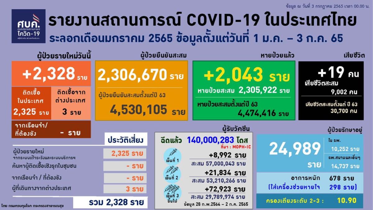 ขณะที่สาธารณสุข แถลงสถานการณ์ตั้งแต่ 1 มกราคม 2565 พบผู้ติดเชื้อโควิด-19 เพิ่ม 2,328 ราย สะสมเป็น 2,306,670 ราย เสียชีวิตเพิ่ม 19 ราย เสียชีวิตสะสม 9,002 ราย หายป่วยวันนี้ 2,043 ราย สะสม 2,305,922 ราย รักษาตัวอยู่ 24,989 ราย