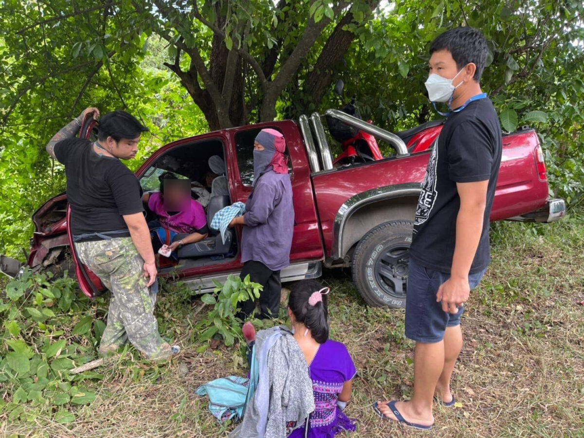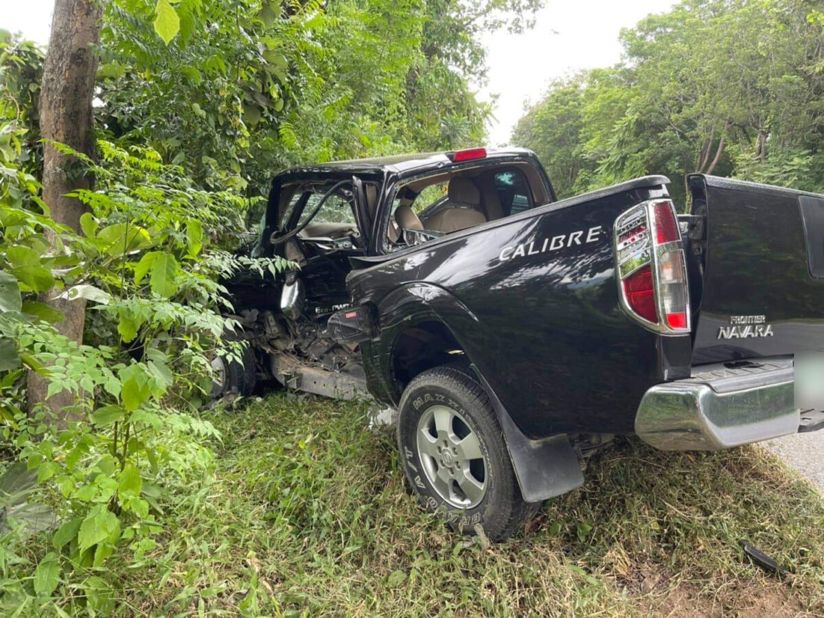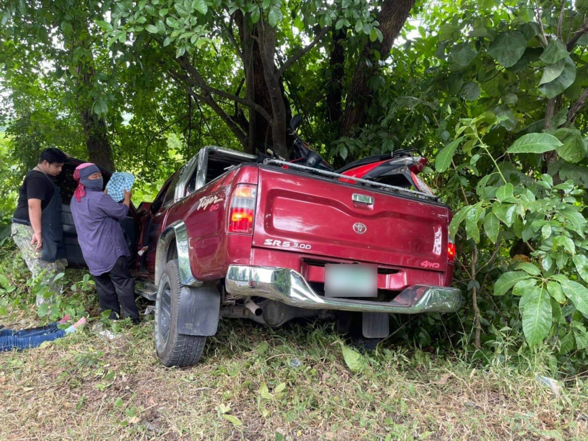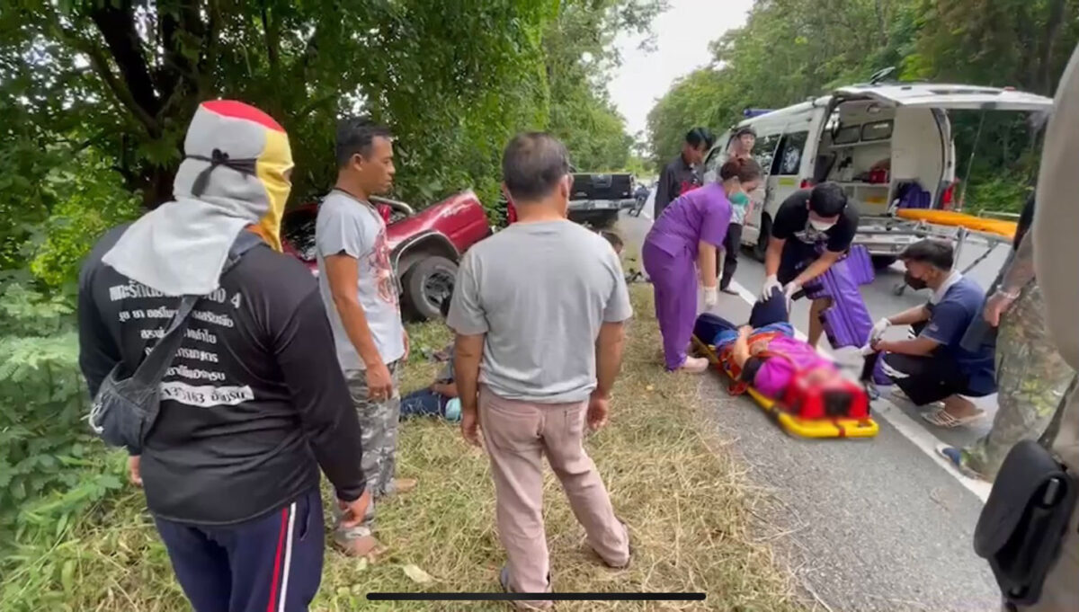 ในที่เกิดเหตุมีรถยนต์กระบะยี่ห้อโตโยต้า ไทเกอร์สีแดง บรรทุกรถจยย.ท้ายกระบะชนกับต้นไม้ข้างทาง มีผู้บาดเจ็บ จำนวน 3 คน เป็นชาย 1 คน หญิง 2 คน ร้องครวญครางด้วยความเจ็บปวดนำตัวส่ง รพ.ดอยเต่า