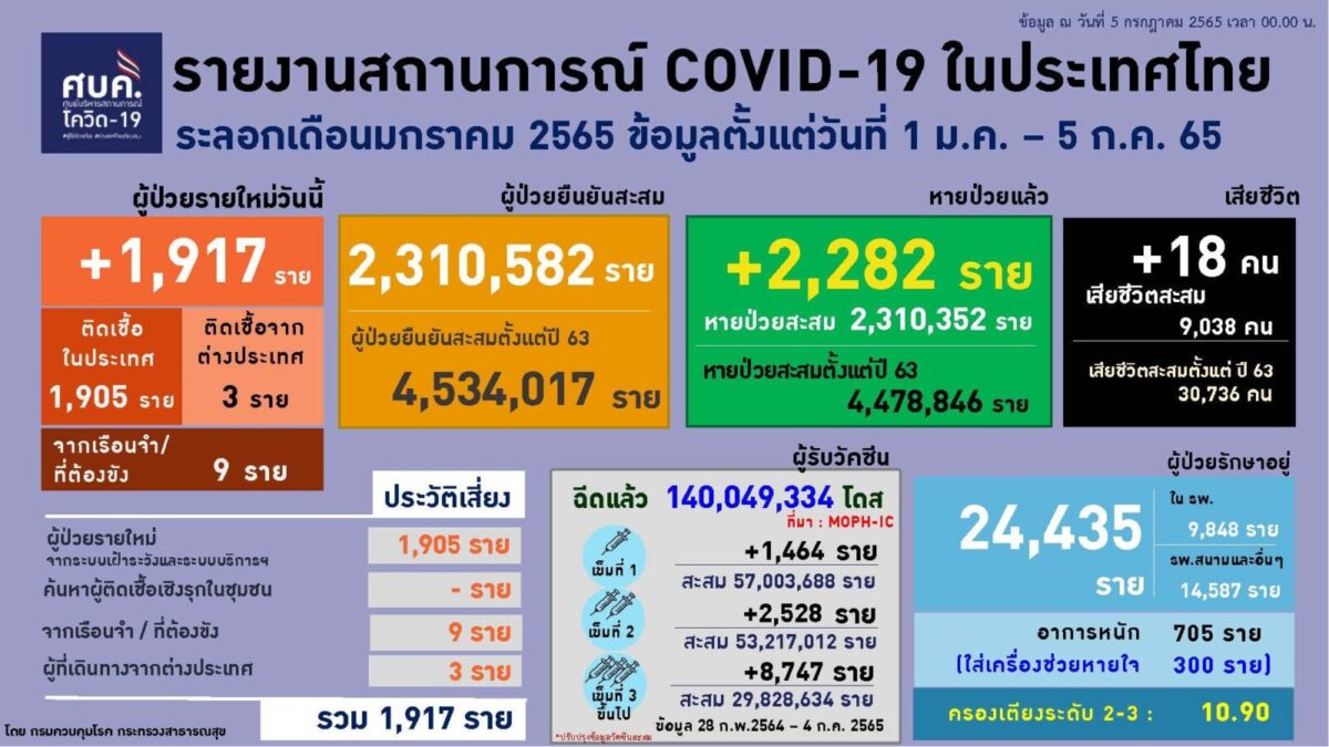 ขณะที่สาธารณสุข แถลงสถานการณ์ตั้งแต่ 1 มกราคม 2565 พบผู้ติดเชื้อโควิด-19 เพิ่ม 1,917 ราย สะสมเป็น 2,310,582 ราย เสียชีวิตเพิ่ม 18 ราย เสียชีวิตสะสม 9,038 ราย หายป่วยวันนี้ 2,282 ราย สะสม 2,310,352 ราย รักษาตัวอยู่ 24,435 ราย