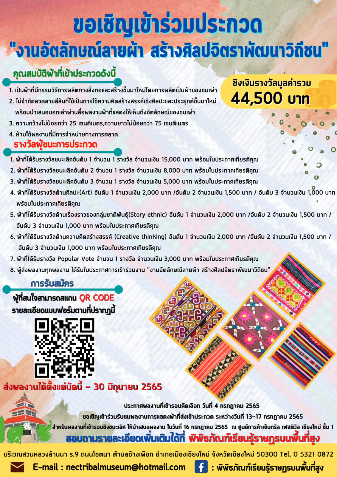 พิพิธภัณฑ์เรียนรู้ราษฎรบนพื้นที่สูง ขอเชิญชวนประชาชน ร่วมชมกิจกรรมการประกวด “งานอัตลักษณ์ลายผ้า สร้างศิลปจิตราพัฒนาวิถีชน” เพื่อรักษาและส่งเสริมเอกลักษณ์ของราษฎรในพื้นที่สูงให้คงคุณค่าตลอดไป
