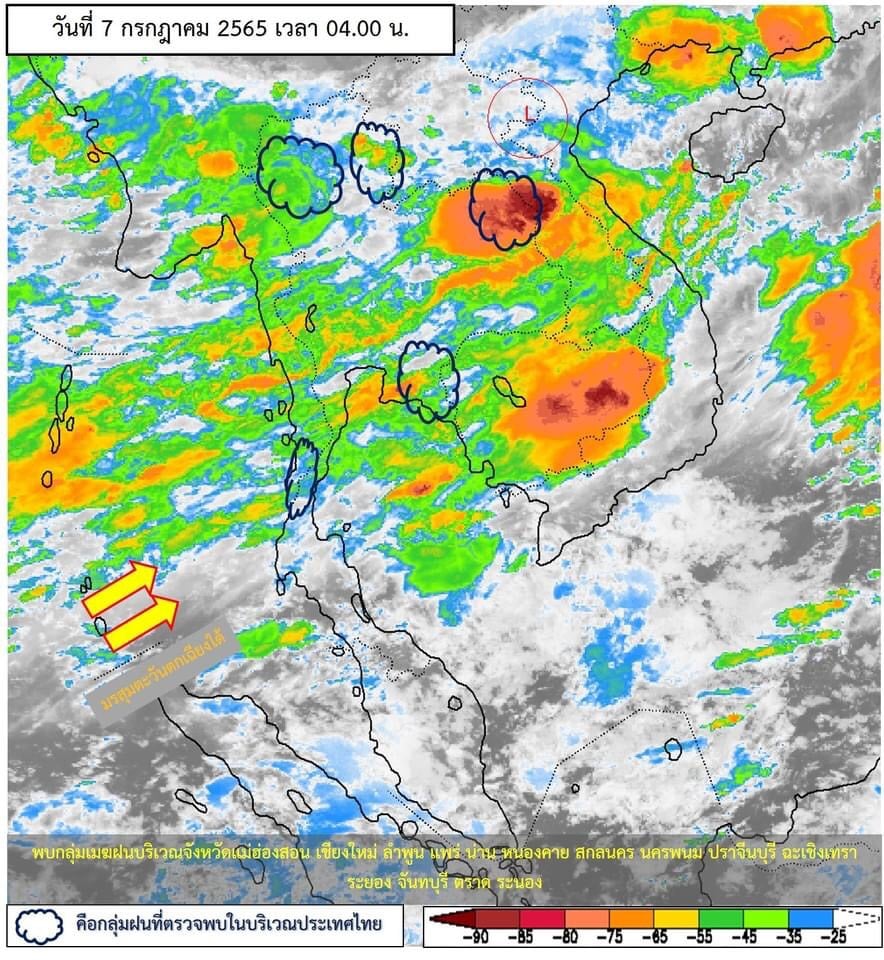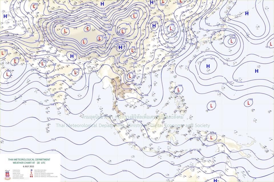 ลักษณะอากาศทั่วไป พยากรณ์อากาศ 24 ชั่วโมงข้างหน้า มรสุมตะวันตกเฉียงใต้กำลังปานกลาง พัดปกคลุมทะเลอันดามัน ประเทศไทย และอ่าวไทย ประกอบกับมีหย่อมความกดอากาศต่ำ บริเวณประเทศเวียดนามตอนบน ลักษณะเช่นนี้ยังคงทำให้ภาคเหนือ ภาคตะวันออกเฉียงเหนือ ภาคตะวันออก และภาคใต้ฝั่งตะวันตก มีฝนตกหนักบางแห่ง ขอให้ประชาชนบริเวณดังกล่าว ระวังอันตรายจากฝนตกหนักและฝนที่ตกสะสม ซึ่งอาจทำให้เกิดน้ำท่วมฉับพลันและน้ำป่าไหลหลากได้