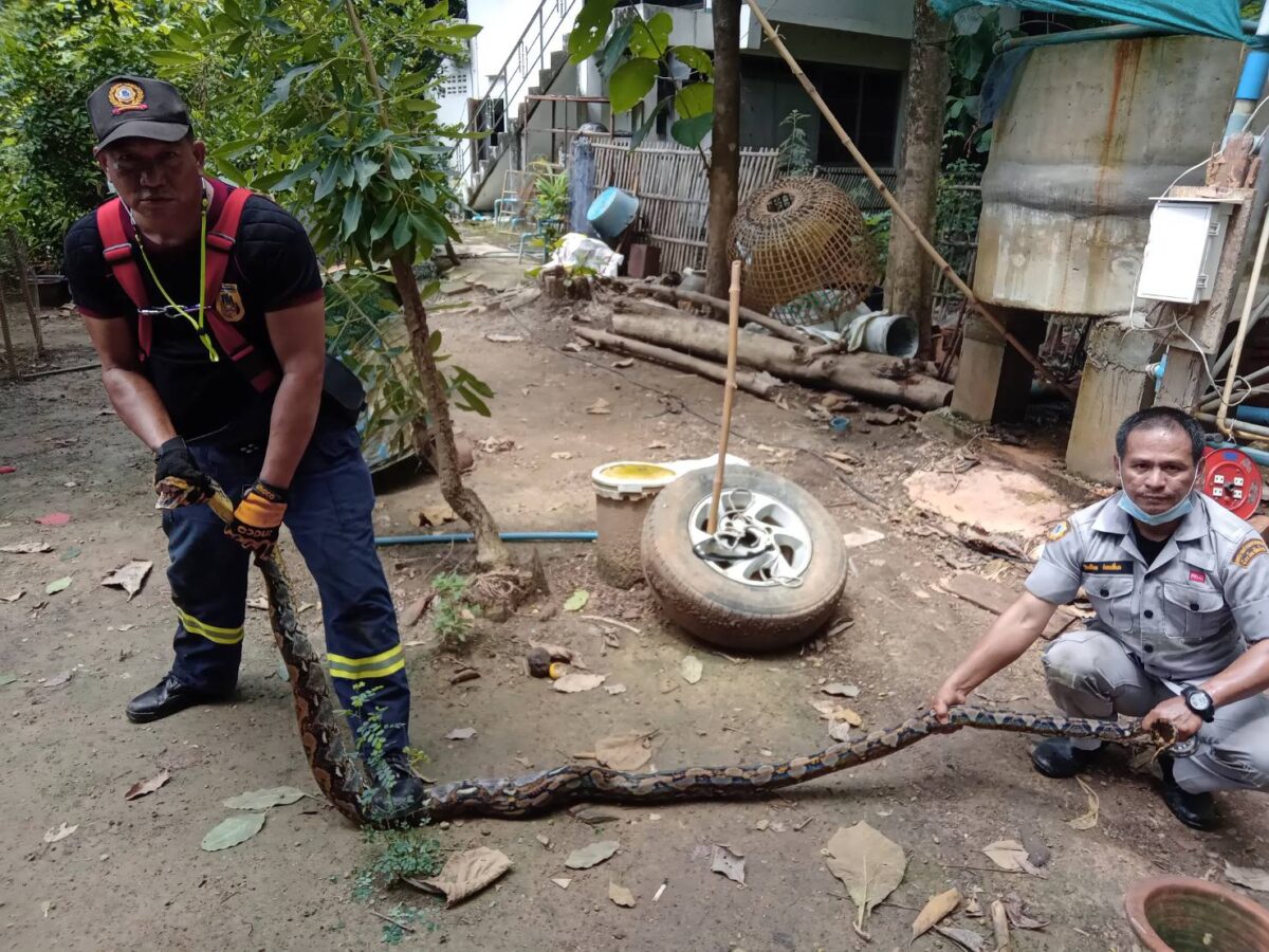 งูเหลือมยาว 3 เมตรเข้ากินไก่เจ้าของบ้านเจอคายไก่หนีลงถังเก็บน้ำลึกสองเมตรป้องกันฯ ต้องสูบน้ำออกหมดถังจึงจับตัวได้
