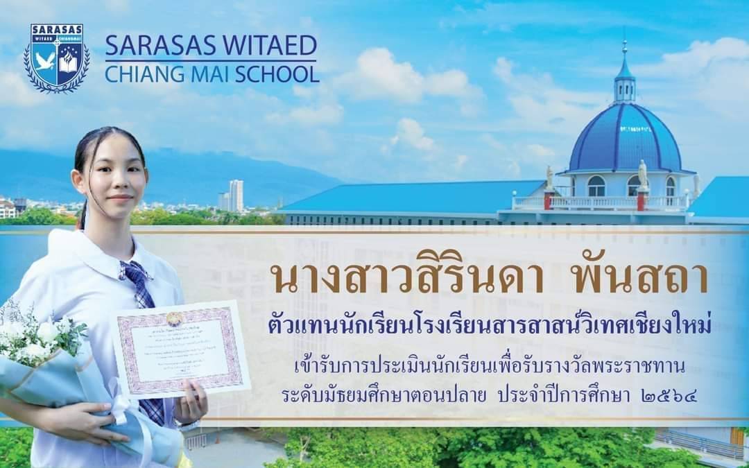สำหรับรางวัลพระราชทาน ประจำปี 2564นี้ กระทรวงศึกษาธิการ ได้มีนักเรียนจากสถานศึกษาต่างๆได้รับรางวัลในแต่ละจังหวัด ทั้งในโรงเรียนขนาดเล็ก ขนาดกลาง และขนาดใหญ่ นางสาวสิรินดา พันสถา (น้องใบบัว)นักเรียนโรงเรียนสารสาสน์วิเทศเชียงใหม่ (G12) นักกีฬาเพาะกาย และฟิตเนตทีมชาติไทย ได้รับรางวัลนักเรียนพระราชทาน ประจำปี 2564 ระดับมัธยมศึกษาตอนปลาย โรงเรียนขนาดเล็ก