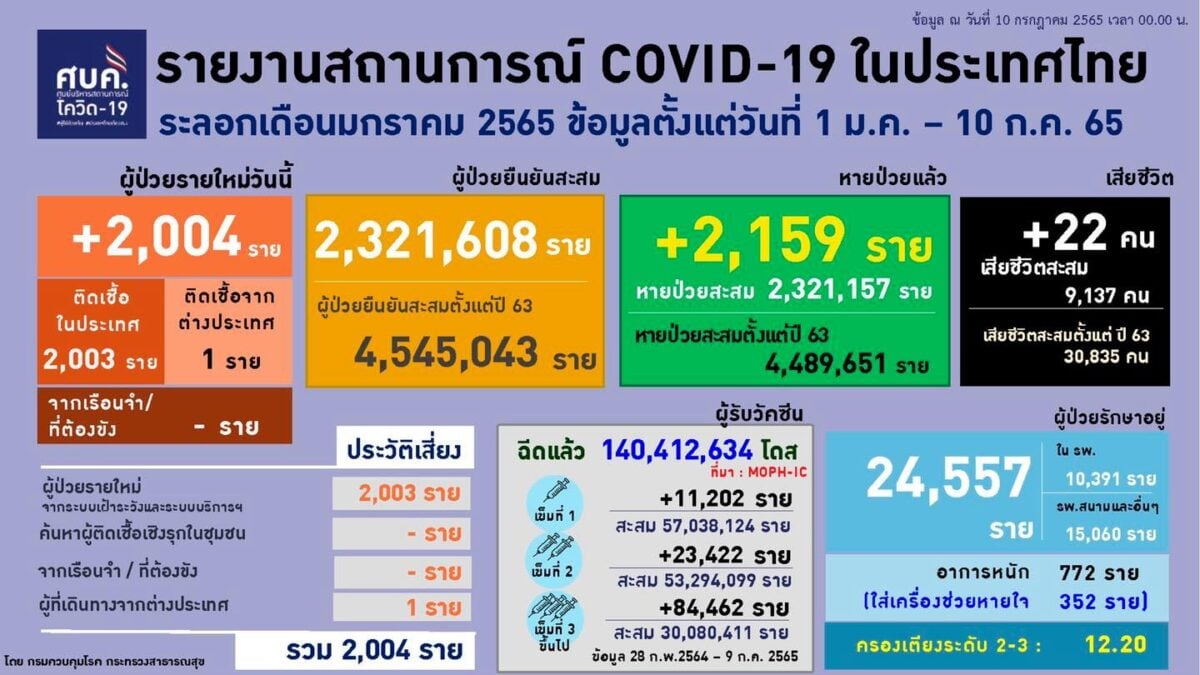 ขณะที่สาธารณสุข แถลงสถานการณ์ตั้งแต่ 1 มกราคม 2565 พบผู้ติดเชื้อโควิด-19 เพิ่ม 2,004 ราย สะสมเป็น 2,321,608 ราย เสียชีวิตเพิ่ม 22 ราย เสียชีวิตสะสม 9,137 ราย หายป่วยวันนี้ 2,159 ราย สะสม 2,321,157 ราย รักษาตัวอยู่ 24,557 ราย