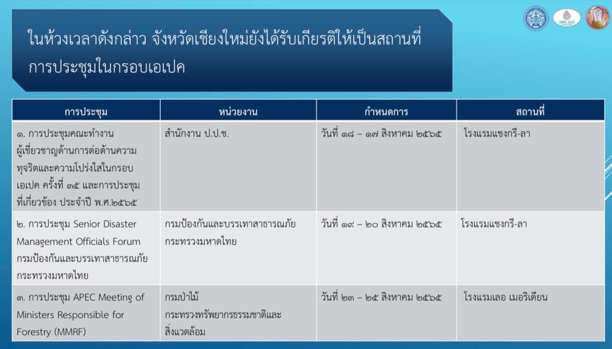 วันที่ 19 ก.ค. 65 นายพิพัฒน์พงษ์ พุทธวงศ์ ผู้อำนวยการ กลุ่มงานอำนวยการ สำนักงานจังหวัดเชียงใหม่ เปิดเผยในการแถลงข่าวสื่อมวลชนประจำสัปดาห์จังหวัดเชียงใหม่ ว่าตามที่ในปี พ.ศ. 2565 ประเทศไทยเป็นเจ้าภาพการประชุมผู้นำเขตเศรษฐกิจเอเปค และการประชุมที่เกี่ยวข้อง