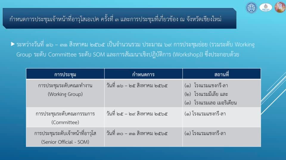 โดยในส่วนของจังหวัดเชียงใหม่ ได้รับเกียรติให้เป็นสถานที่สำหรับการประชุมเจ้าหน้าที่อาวุโสเอเปค ครั้งที่ 3 และการประชุมที่เกี่ยวข้อง (3rd APEC Senior Officials and Related Meeting หรือ SOM 3) ระหว่างวันที่ 16-31 สิงหาคม 2565 ณ โรงแรมแชงกรีลา เชียงใหม่ โรงแรมมีเลีย และโรงแรมเลอ เมอริเดียน ซึ่งจัดขึ้นโดยกระทรวงการต่างประเทศ นอกจากนี้ จังหวัดเชียงใหม่ ยังเป็นสถานที่จัดประชุมในกรอบเอเปคอีกหลายการประชุม ได้แก่ การประชุมคณะทำงานผู้เชี่ยวชาญด้านการต่อต้านความทุจริต และความโปร่งใสในกรอบเอเปค ครั้งที่ 35 และการประชุมที่เกี่ยวข้อง ประจำปี พ.ศ. 2565 โดยสำนักงาน ป.ป.ช., การประชุม Senior Disaster Management Officials Forum โดยกรมป้องกันและบรรเทาสาธารณภัย กระทรวงมหาดไทย และการประชุม APEC Meeting of Ministers Responsible for Forestry (MMRF) โดยกรมป่าไม้ กระทรวงทรัพยากรธรรมชาติและสิ่งแวดล้อม
