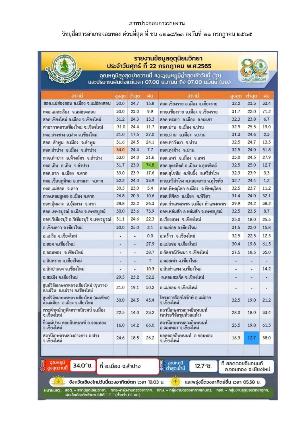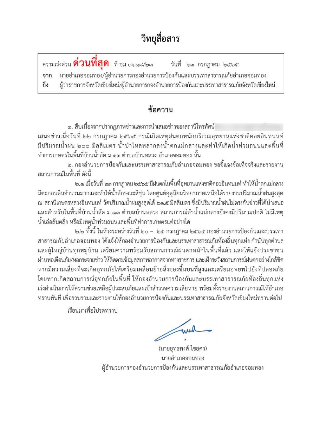 วันนี้ (23 กรกฎาคม 2565) นายประจญ ปรัชญ์สกุล ผู้ว่าราชการจังหวัดเชียงใหม่ แจ้งว่า ตามที่มีการปรากฎภาพข่าวและการนำเสนอข่าวของสถานีโทรทัศน์ช่อง 8 รายการคุยข่าวเช้ารุ่งอรุณ เมื่อวันที่ 22 กรกฎาคม 2565 กรณีเกิดเหตุฝนตกหนักบริเวณอุทยานแห่งชาติดอยอินทนนท์ มีปริมาณน้ำฝน 200 มิลลิเมตร น้ำป่าไหลหลากลงน้ำตกแม่กลาง และทำให้เกิดน้ำท่วมถนนและพื้นที่ทำการเกษตร ในพื้นที่บ้านน้ำลัด ม.13 ตำบลบ้านหลวง อำเภอจอมทอง นั้น