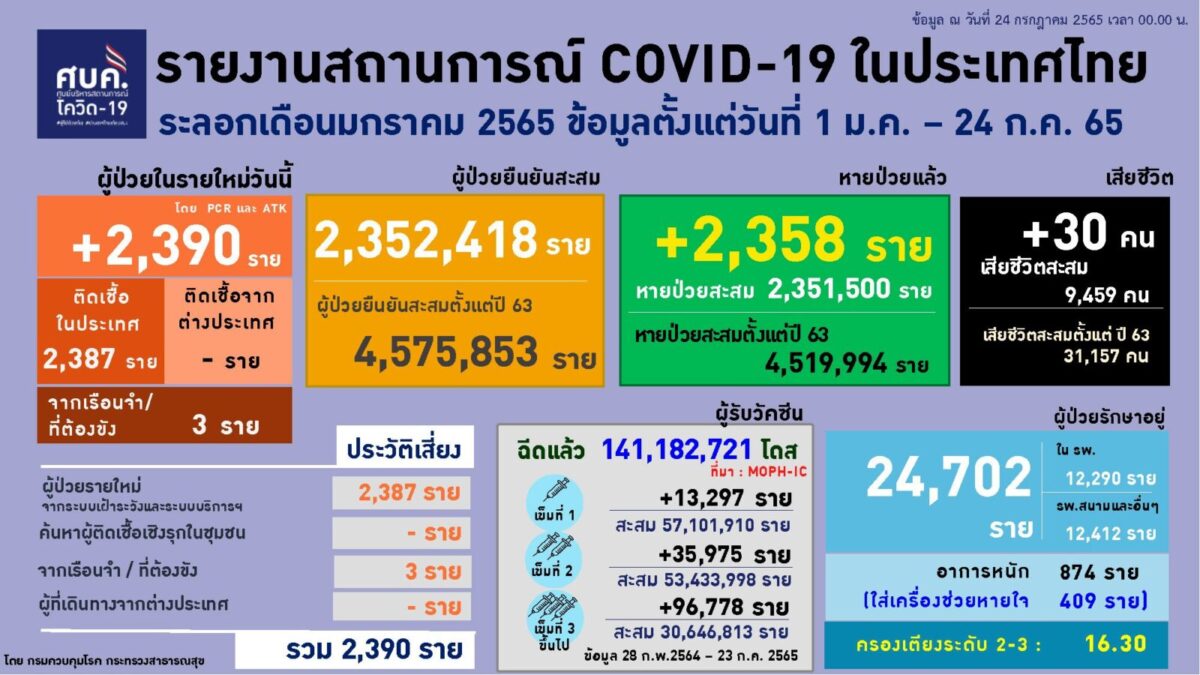 ขณะที่สาธารณสุข แถลงสถานการณ์ตั้งแต่ 1 มกราคม 2565 พบผู้ติดเชื้อโควิด-19 เพิ่ม 2,390 ราย สะสมเป็น 2,352,418 ราย เสียชีวิตเพิ่ม 30 ราย เสียชีวิตสะสม 9,459 ราย หายป่วยวันนี้ 2,358 ราย สะสม 2,351,500 ราย รักษาตัวอยู่ 24,702 ราย
