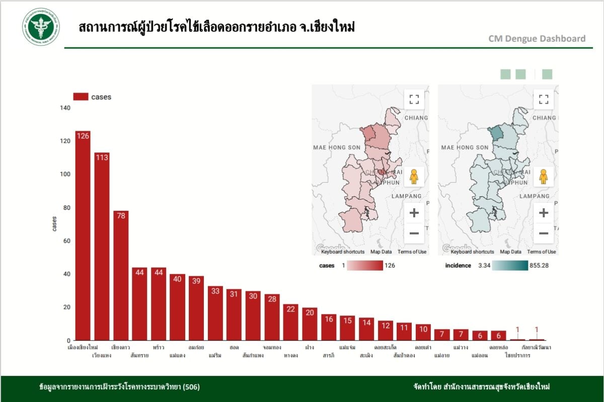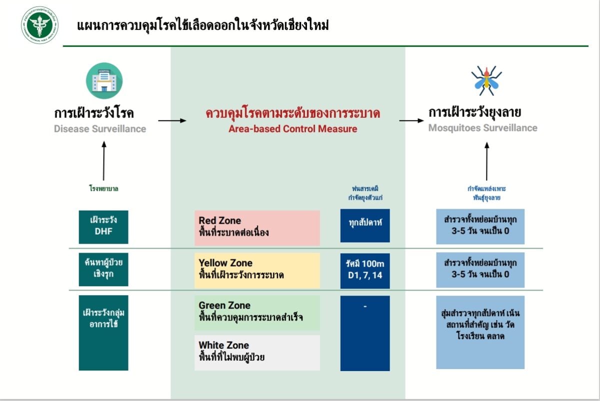 โดยสำนักงานสาธารณสุขจังหวัดเชียงใหม่ ได้รายงานสถานการณ์แพร่ระบาดโรคไข้เลือดออกว่า จังหวัดเชียงใหม่พบผู้ป่วยติดเชื้อ 768 ราย อำเภอที่มีผู้ติดเชื้อสูง 3 อันดับ ได้แก่ อำเภอเมืองเชียงใหม่ 126 ราย อำเภอเวียงแหง 113 ราย อำเภอเชียงดาว 78 ราย ด้านนายแพทย์กิตติพันธุ์ ฉลอม ผู้ช่วยนายแพทย์สาธารณสุขจังหวัดเชียงใหม่ ได้กล่าวถึงมาตรการควบคุมโรคไข้เลือดออกในพื้นที่จังหวัดเชียงใหม่ว่า ขณะนี้จังหวัดเชียงใหม่ มีแผนปฏิบัติการควบคุมโรคและเฝ้าระวังกำจัดยุงลาย ตามระดับของการระบาด โดยพื้นที่สีแดง ที่พบการแพร่ระบาดต่อเนื่องไม่ต่ำกว่า 2 สัปดาห์ ให้ทำการพ่นสารเคมีกำจัดยุงตัวแก่ทุกสัปดาห์ พื้นที่สีเหลือง ซึ่งพบผู้ป่วยแต่ยังไม่พบการแพร่ระบาด ให้ทำการพ่นสารเคมีกำจัดยุงตัวแก่ในรัศมี 100 เมตร พร้อมสำรวจบ้านเรือนประชาชนทุก 3-5 วัน ซึ่งหากดำเนินการตามมาตรการนี้จะสามารถควบคุมการระบาดของโรคได้ ส่วนพื้นที่สีเขียวยังไม่พบการติดเชื้อ ให้มีการสุ่มสำรวจตามจุดเสี่ยงทุกสัปดาห์ โดยเน้นสถานที่สำคัญ เช่น วัด โรงเรียน ตลาด พร้อมดูแลติดตามสถานการณ์อย่างใกล้ชิด
