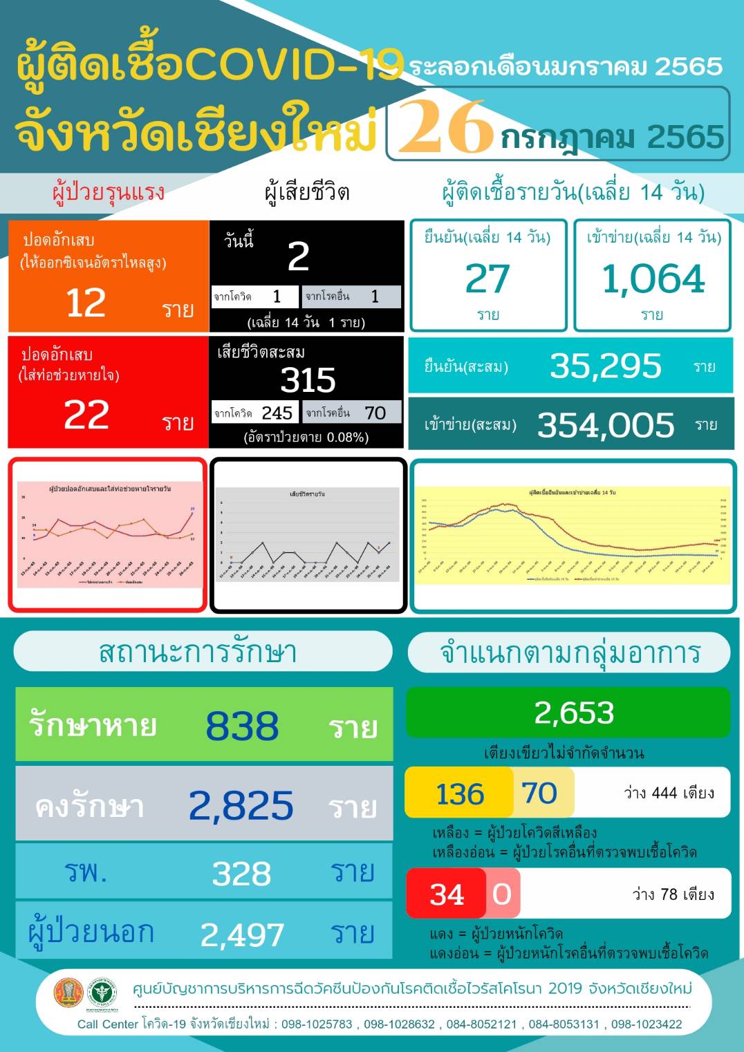 สถานการณ์ Covid-19 จ.เชียงใหม่ พบผู้ติดเชื้อเพิ่ม 27 ราย เสียชีวิตเพิ่ม 2 รายเข้าข่ายติดเชื้อสะสม 354,005 ราย