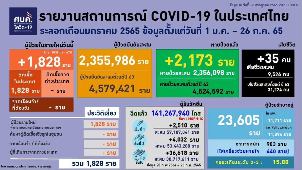 ขณะที่สาธารณสุข แถลงสถานการณ์ตั้งแต่ 1 มกราคม 2565 พบผู้ติดเชื้อโควิด-19 เพิ่ม 1,828 ราย สะสมเป็น 2,355,986 ราย เสียชีวิตเพิ่ม 35 ราย เสียชีวิตสะสม 9,526 ราย หายป่วยวันนี้ 2,173 ราย สะสม 2,356,098 ราย รักษาตัวอยู่ 23,605 ราย