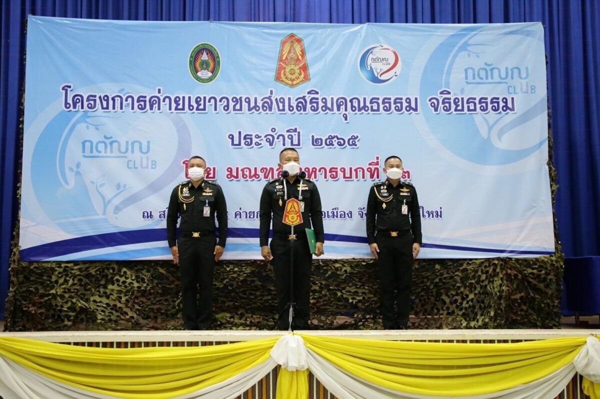 เมื่อวันที่ 23 – 24 กรกฎาคม 2565 กองพัฒนานักศึกษา มหาวิทยาลัยราชภัฏเชียงใหม่ ร่วมกับ มณฑลทหารบกที่ 33 ดำเนินโครงการค่ายเยาวชนส่งเสริมคุณธรรม-จริยธรรม ประจำปี 2565 ณ สโมสรกาวิละ ค่ายกาวิละ อำเภอเมือง จังหวัดเชียงใหม่ โดยได้รับเกียรติจาก พ.อ.โภคา จอกลอย รองเสนาธิการมณฑลทหารบกที่ 33 เป็นประธานเปิดโครงการ ซึ่งได้จัดการฝึกอบรมตามแนวทางที่กองกิจการพลเรือนทหารบก (กร.ทบ.) กำหนดไว้ ประกอบด้วย ความรู้เกี่ยวกับประวัติศาสตร์ท้องถิ่น ประวัติศาสตร์ชาติไทย การเรียนรู้โครงการทหารพันธุ์ดี พล.ร.7 รวมทั้งพระราชกรณียกิจของในหลวงรัชกาลที่ 9 ที่ทรงมีพระราชดำริให้สร้างอ่างเก็บน้ำห้วยตึงเฒ่า เพื่อช่วยเหลือเกษตรกรในพื้นที่จังหวัดเชียงใหม่ ณ อ่างเก็บน้ำห้วยตึงเฒ่า การศึกษาประวัติความเป็นมาของจังหวัดเชียงใหม่ ณ หอศิลปวัฒนธรรมเมืองเชียงใหม่ และวัดสวนดอก พร้อมกันนี้ได้ดำเนินกิจกรรมจิตอาสา บำเพ็ญสาธารณประโยชน์เก็บกวาดใบไม้และเช็ดถูทำความสะอาดวิหารหลวง ณ วัดสวนดอก พระอารามหลวง