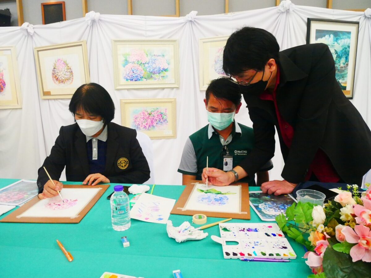 เวลา 13.30 น. เริ่มกิจกรรมถ่ายทอดสุนทรียภาพ โดยการวาดภาพสีน้ำ จำนวน 4 ครั้งๆ ที่ 1 วิทยากรสมาคมสีน้ำโลก ประจำภาคเหนือของประเทศไทย ประกอบด้วย นายรัชพล ศิรดิษย์ ,อ.โอภาส ชมชื่น ,อ.ดร.กนิษฐา พวงศรี ,ผศ.ปฏิเวช เสาว์คง ในครั้งแรกมีผู้ร่วมอบรมจำนวน 10 ท่าน ฝึกเขียนภาพดอกไฮเดรนเยีย (Hydrangea) การร่างภาพและลงสี ในรุ่นแรกที่มีความตั้งใจเรียนกันอย่างมาก ณ อาคารเฉลิมพระบารมี ชั้น 1 โรงพยาบาลมหาราชนครเชียงใหม่