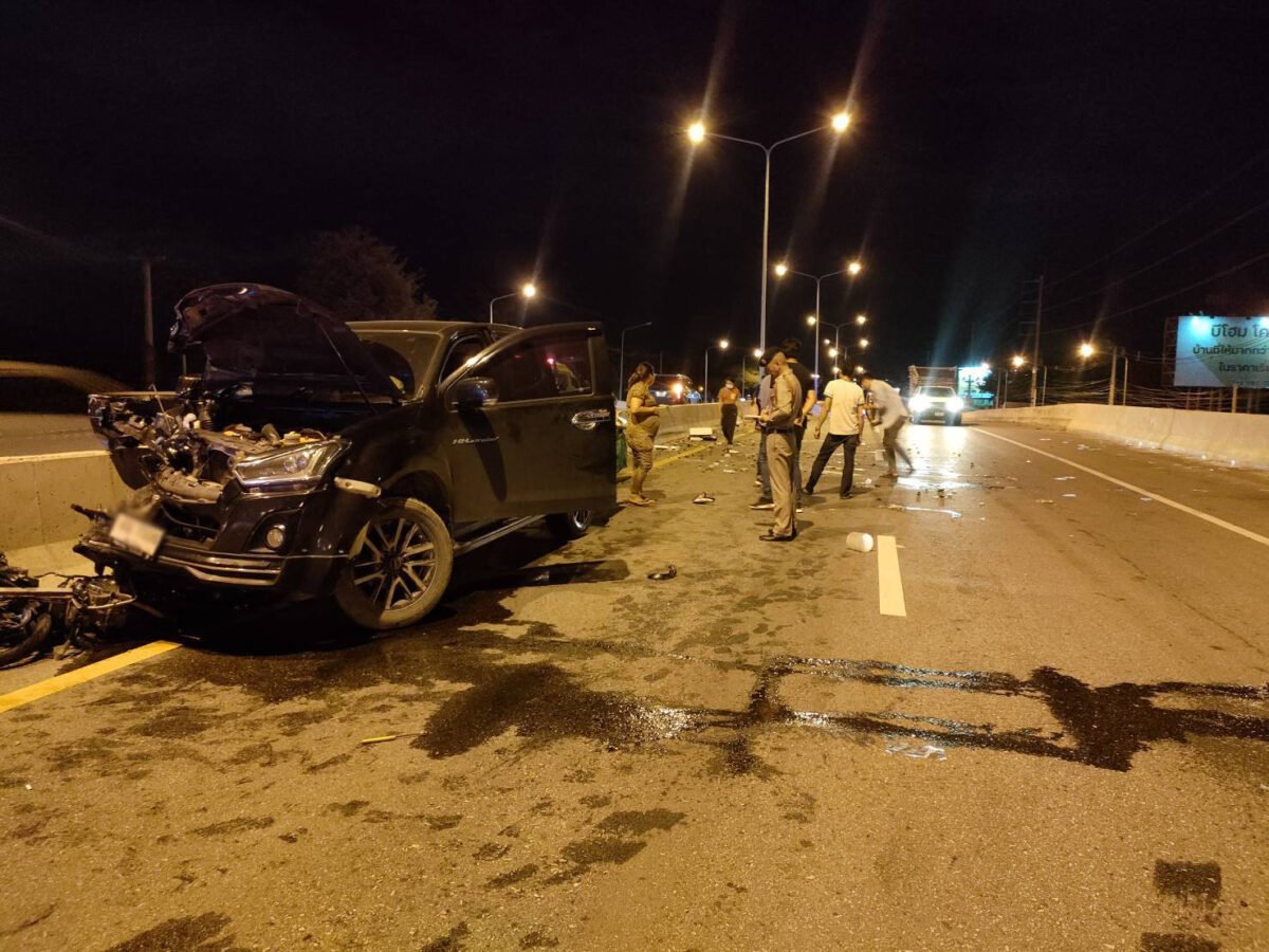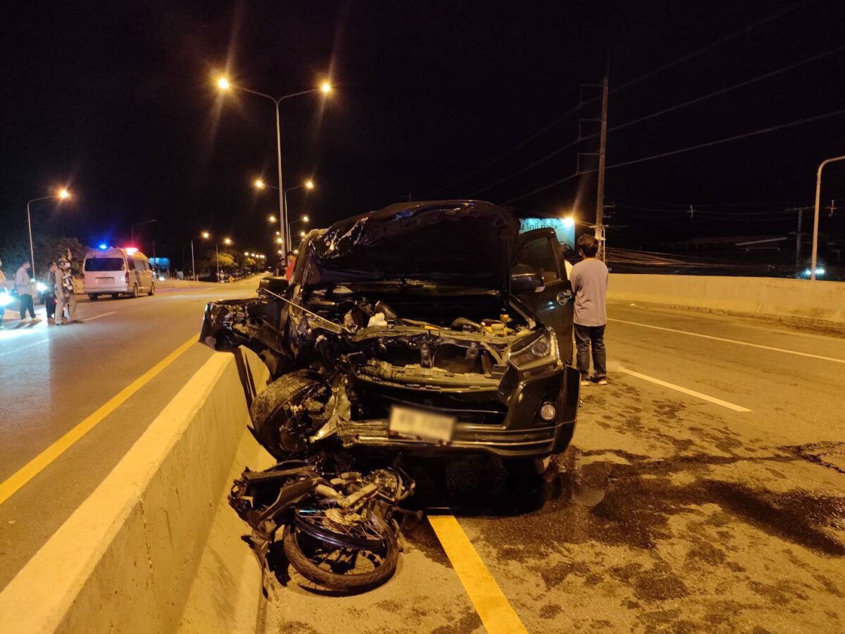 หนุ่มซิ่ง จ.ย.ย.ย้อนศร ขึ้นสะพานท่ารั้วชนรถกระบะเละ