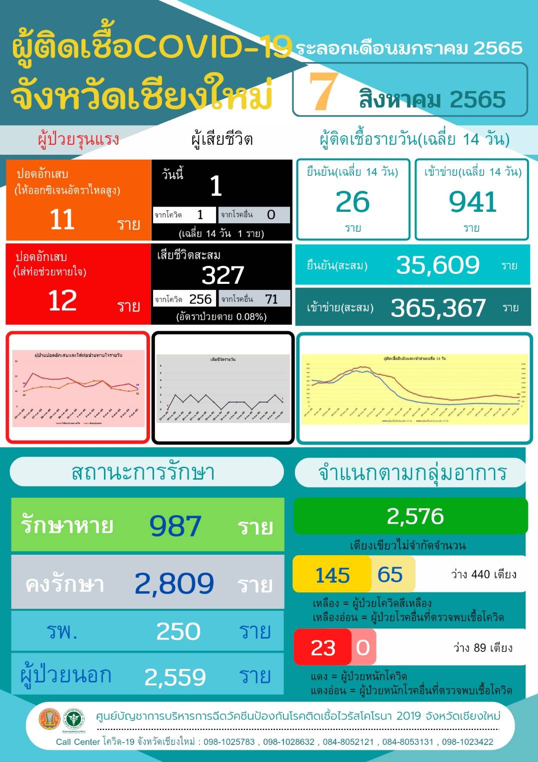 สาธารณสุข จ.เชียงใหม่ เผยสถานการณ์ COVID-19 ในพื้นที่ พบผู้ป่วย Covid-19 ยืนยันเพิ่ม 26 ราย สะสม 35,609 ราย มีผู้เสียชีวิตเพิ่ม 1 ราย เสียชีวิตสะสม 327 ราย เข้าข่ายติดเชื้อสะสม 365,367 ราย รักษาตัวอยู่ 2,809 ราย รักษาหายวันนี้ 987 ราย เมื่อวันที่ 7 ส.ค. 2565 (13.00 น.)