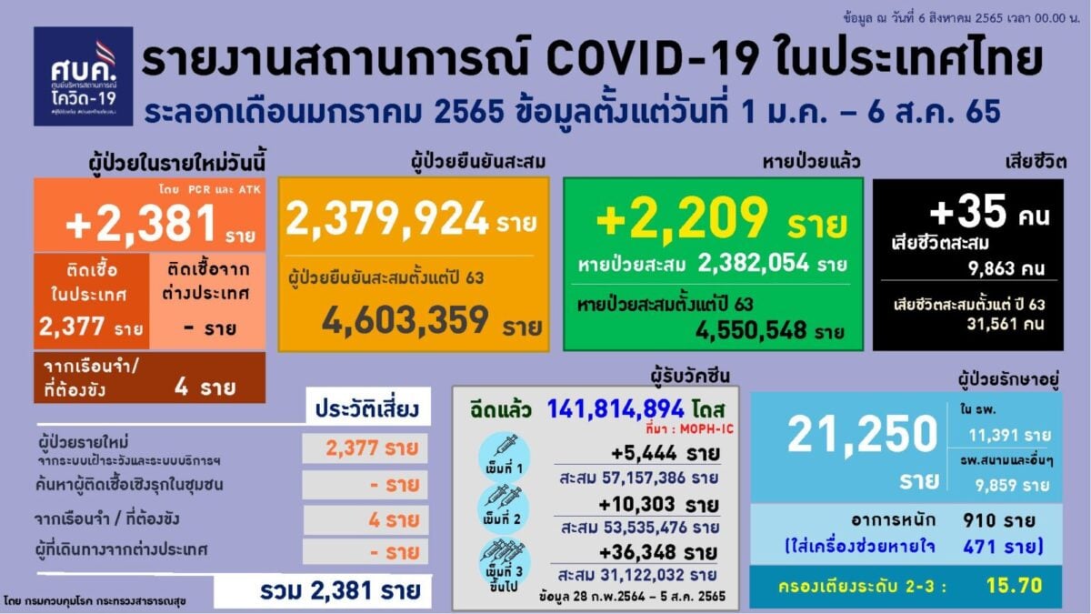 ขณะที่สาธารณสุข แถลงสถานการณ์ตั้งแต่ 1 มกราคม 2565 พบผู้ติดเชื้อโควิด-19 เพิ่ม 2,381 ราย สะสมเป็น 2,382,054 ราย เสียชีวิตเพิ่ม 35 ราย เสียชีวิตสะสม 9,863 ราย หายป่วยวันนี้ 2,209 ราย สะสม 2,382,054 ราย รักษาตัวอยู่ 21,250 ราย