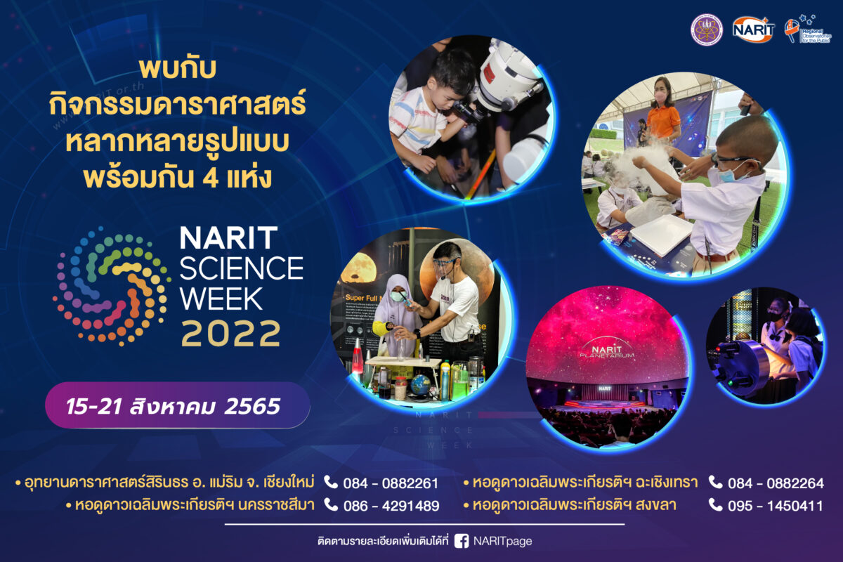 นายศุภฤกษ์ คฤหานนท์ ผู้อำนวยการศูนย์บริการวิชาการทางดาราศาสตร์ สดร. เปิดเผยว่า สดร. เตรียมจัดงานสัปดาห์วิทยาศาสตร์ 2565 (NARIT Science Week 2022) เนื่องในโอกาสวันวิทยาศาสตร์แห่งชาติ ระหว่างวันที่ 15 – 21 สิงหาคม 2565 ระดมทีมส่วนกลางและภูมิภาค จัดกิจกรรมดาราศาสตร์ และวิทยาศาสตร์ในรูปแบบ online และ on-site พร้อมกัน 4 แห่ง พบกับรูปแบบ onsite ได้ที่อุทยานดาราศาสตร์สิรินธร อำเภอแม่ริม จังหวัดเชียงใหม่ และหอดูดาวเฉลิมพระเกียรติ 7 รอบ พระชนมพรรษา นครราชสีมา ฉะเชิงเทรา และสงขลา ตั้งแต่เวลา 09:00 – 17:00 น. ท่องเอกภพในฟูลโดมดิจิทัลกับซอฟต์แวร์ท้องฟ้าจำลองฝีมือคนไทย ตื่นตาตื่นใจกับกองทัพภาพยนตร์ดาราศาสตร์ ผจญภัยแบบได้ความรู้กับนิทรรศการดาราศาสตร์หลากหลายโซน และกิจกรรมดาราศาสตร์และวิทยาศาสตร์มากมาย อาทิ ปืนใหญ่วงแหวนอากาศ มหัศจรรย์แห่งเสียง ฯลฯ และกิจกรรม mammals bingo จากจัตุรัสวิทยาศาสตร์ อพวช. เชียงใหม่