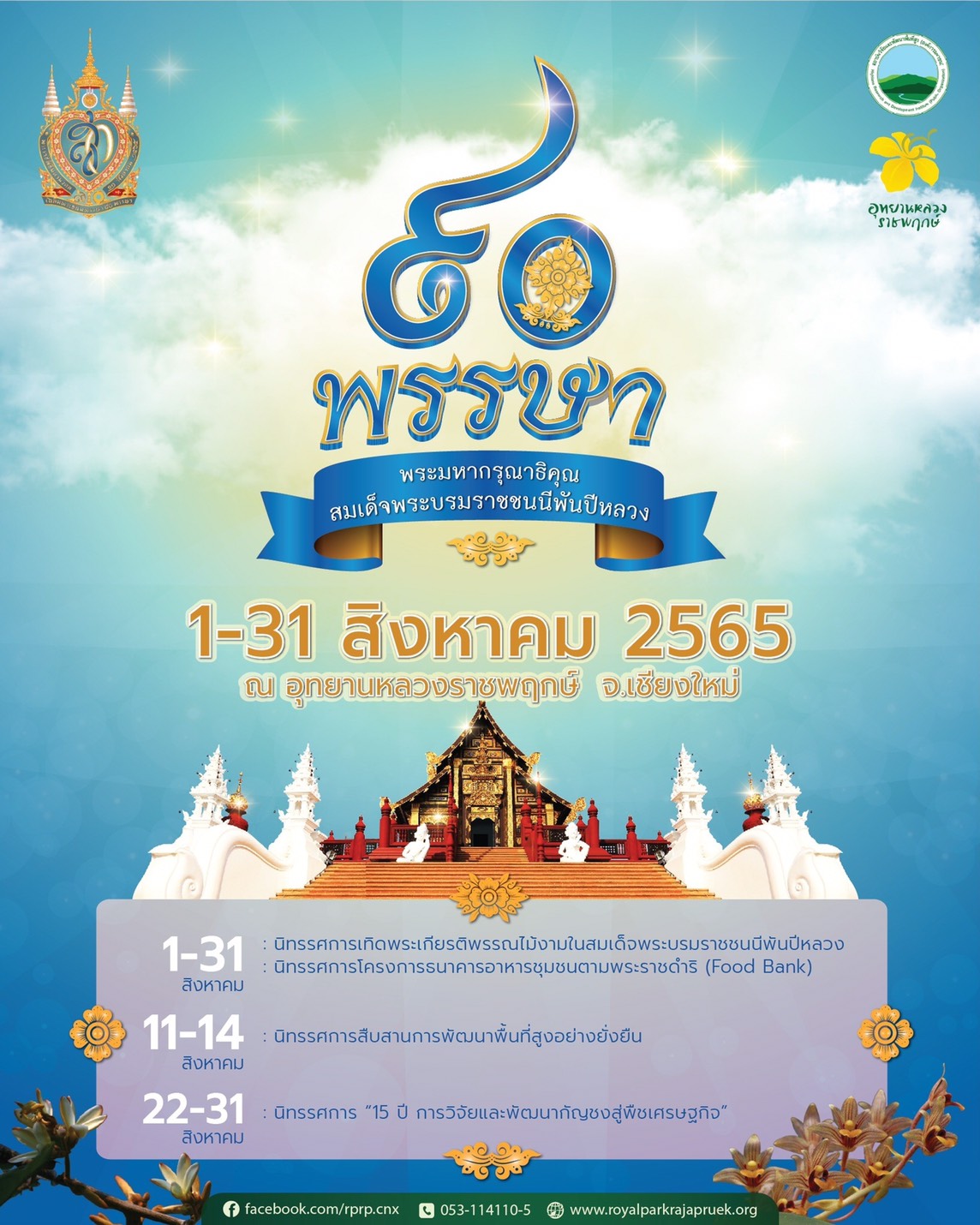สถาบันวิจัยและพัฒนาพื้นที่สูง (องค์การมหาชน) ร่วมกับ มูลนิธิโครงการหลวง จัดงาน “90 พรรษา พระมหากรุณาธิคุณ สมเด็จพระบรมราชชนนีพันปีหลวง” ระหว่างวันที่ 1-31 สิงหาคม 2565 ณ อุทยานหลวงราชพฤกษ์ จังหวัดเชียงใหม่ ภายในงานชมนิทรรศการเทิดพระเกียรติสมเด็จพระบรมราชชนนีพันปีหลวง เนื่องในโอกาสมหามงคลเฉลิมพระชนมพรรษา 90 พรรษา 12 สิงหาคม 2565 พร้อมกิจกรรมที่น่าสนใจมากมายตลอดเดือนสิงหาคม 2565