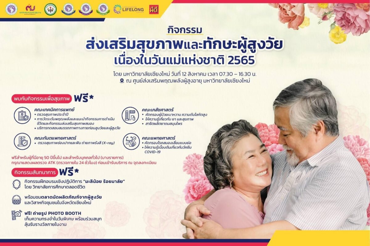 วันศุกร์ที่ 12 สิงหาคม 2565 ชวนมา #บอกรักแม่ ด้วยการดูแลสุขภาพใน ‘กิจกรรมส่งเสริมสุขภาพและทักษะผู้สูงวัย เนื่องในวันแม่แห่งชาติ 2565’ พบกับหลากหลายบริการและสันทนาการเพื่อเติมเต็มคุณภาพชีวิตที่ดีของผู้สูงวัย โดยศูนย์ส่งเสริมพฤฒพลังผู้สูงอายุ มหาวิทยาลัยเชียงใหม่ ร่วมกับ คณะแพทยศาสตร์ คณะเทคนิคการแพทย์ คณะทันตแพทยศาสตร์ คณะเภสัชศาสตร์ และวิทยาลัยการศึกษาตลอดชีวิต มหาวิทยาลัยเชียงใหม่