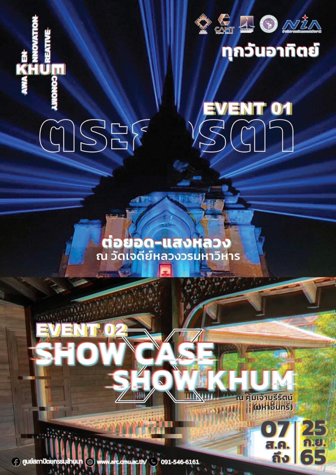 มช. ขอเชิญร่วมชมความยิ่งใหญ่ตระการตา “ต่อยอด แสงหลวง” Lost and Found” the Missing Moment Experience ทุกวันอาทิตย์ ตั้งแต่ 7 สิงหาคม – 25 กันยายน 2565 เวลา 20.00-22.00 น. ณ วัดเจดีย์หลวงวรมหาวิหาร