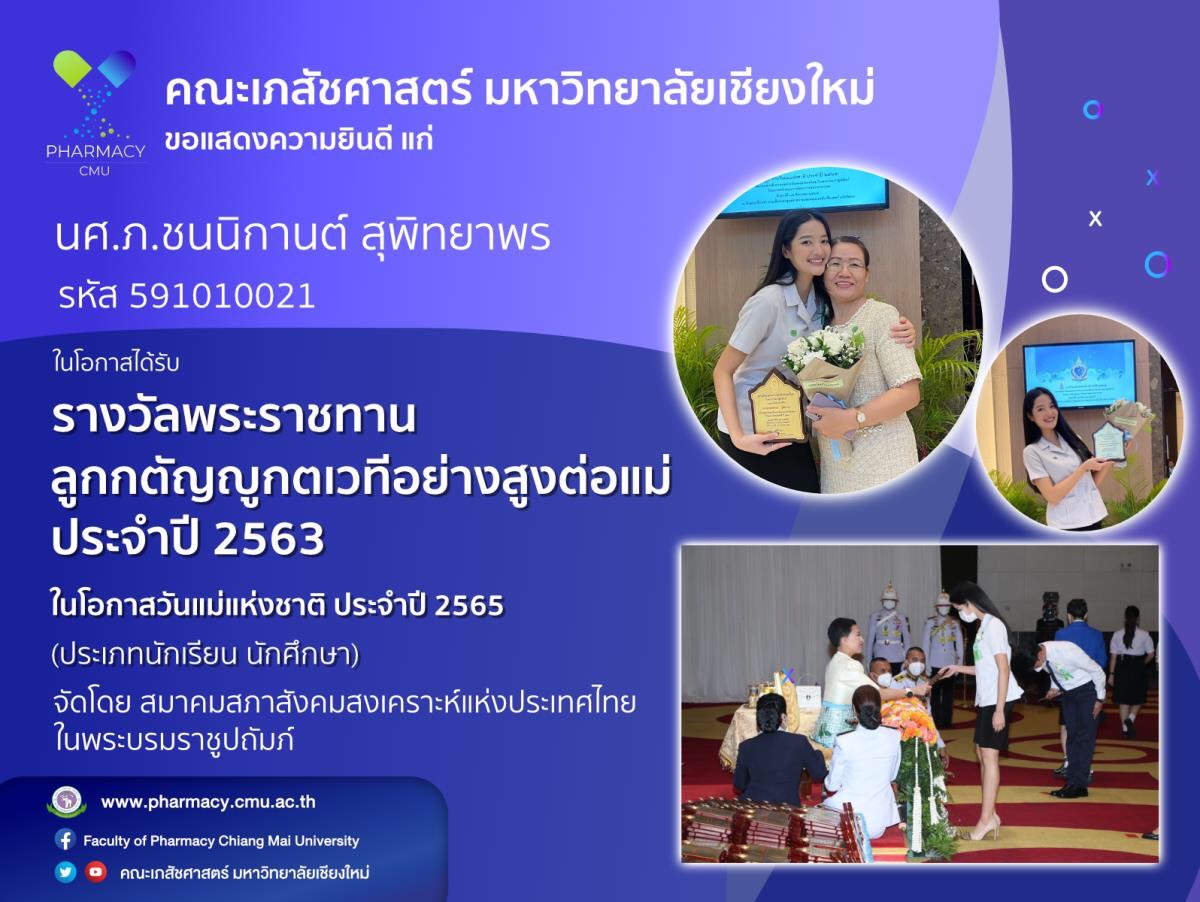 นักศึกษาคณะเภสัชศาสตร์ มช. รับรางวัลพระราชทาน ลูกที่มีความกตัญญูกตเวทีอย่างสูงต่อแม่ ประจำปี 2563 สภาสังคมสงเคราะห์แห่งประเทศไทยฯ เนื่องในวันแม่แห่งชาติ ประจำปี 2565