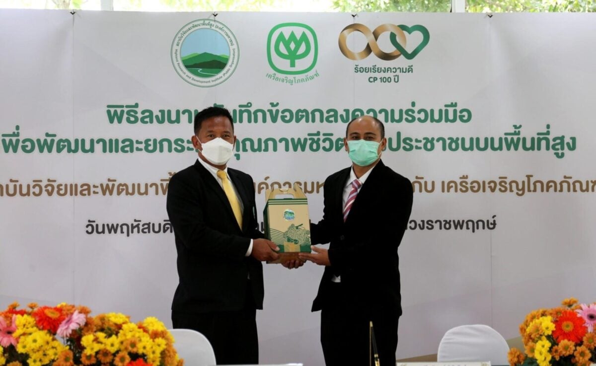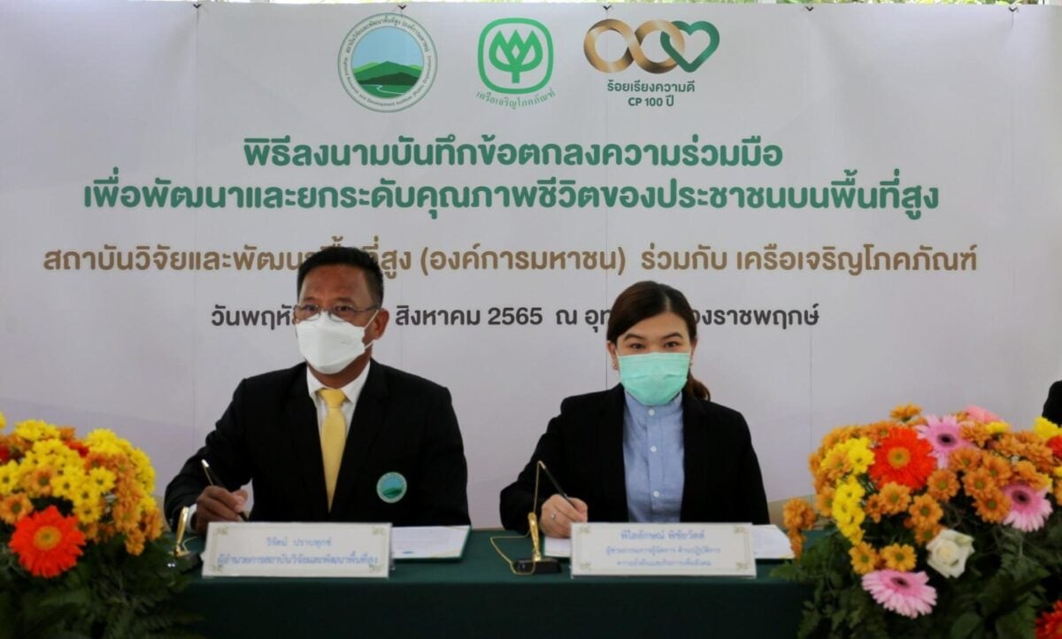 สถาบันวิจัยและพัฒนาพื้นที่สูง (องค์การมหาชน) กำหนดจัดพิธีลงนามบันทึกข้อตกลงความร่วมมือ เพื่อพัฒนาและยกระดับคุณภาพชีวิตของประชาชนบนพื้นที่สูง ระหว่าง สถาบันวิจัยและพัฒนาพื้นที่สูง (องค์การมหาชน) นำโดย นายวิรัตน์ ปราบทุกข์ ผู้อำนวยการสถาบันวิจัยและพัฒนาพื้นที่สูง และฝ่ายพัฒนาความยั่งยืนภาครัฐ เครือเจริญโภคภัณฑ์ นำโดย นางสาวพิไลลักษณ์ พิชัยวัตต์ ผู้ช่วยกรรมการผู้จัดการ ด้านปฏิบัติการความยั่งยืนและกิจการเพื่อสังคม เครือเจริญโภคภัณฑ์ โดยได้รับเกียรติจาก นายชวลิต ชูขจร กรรมการผู้ทรงคุณวุฒิด้านการเกษตร และประธานอนุกรรมการวิจัยและพัฒนา สถาบันวิจัยและพัฒนาพื้นที่สูง กล่าวแสดงความยินดี ในพิธีลงนามบันทึกข้อตกลงความร่วมมือเพื่อพัฒนาและยกระดับคุณภาพชีวิตของประชาชนบนพื้นที่สูง พร้อมด้วย ดร.เพชรดา อยู่สุข รองผู้อำนวยการสถาบันวิจัยและพัฒนาพื้นที่สูง ด้านการพัฒนา นางอาณดา นิรันตรายกุล ผู้อำนวยการอุทยานหลวงราชพฤกษ์ นายอรรถวิทย์ ยุทธยศ ผู้จัดการทั่วไป ด้านปฏิบัติการความยั่งยืน และนายกฤตยรัฐ ปารมี ผู้จัดการมูลนิธิเจริญโภคภัณฑ์พัฒนาชีวิตชนบท ร่วมเป็นสักขีพยาน