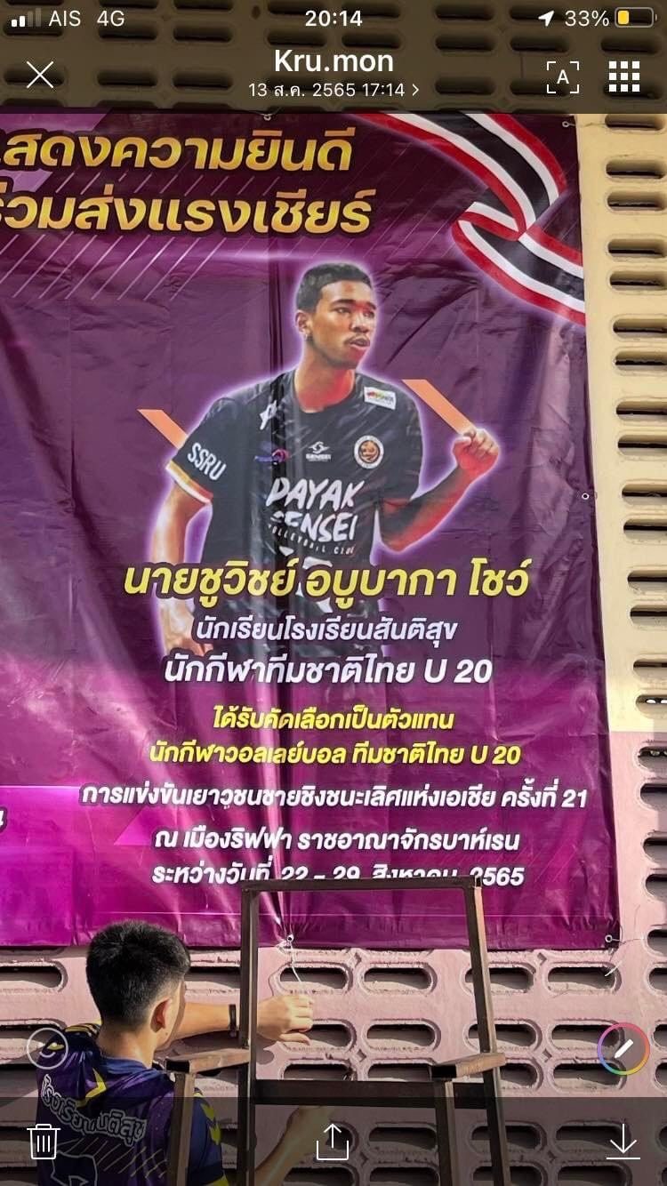 ดร.ศราวุฒิ ขันยา ผู้อำนวยการ โรงเรียนสันติสุข คณะผู้บริหาร คุณตะวัน ศรีสุข ประธานสโมสรกีฬาวอลเลย์บอลสหเวชคริสตัลโฮม Staff Coach นักกีฬา พร้อมด้วยคณะครูบุคลากรทางการศึกษา และนักเรียน โรงเรียนสันติสุข สพม.เชียงใหม่ ร่วมส่งกำลังใจเชียร์ พี่โบกัส นายชูวิชย์ อบูบากาโชว์ นักเรียนชั้นมัธยมศึกษาปีที่ 6 ปีการศึกษา 2564 ผลผลิตจากโรงเรียนสันติสุข อำเภอดอยหล่อ จังหวัดเชียงใหม่ นักกีฬาวอลเลย์บอลชาย รุ่นอายุต่ำกว่า 20 ปี ทีมชาติไทย เดินทางเข้าร่วมแข่งขันวอลเลย์บอลชายชิงชนะเลิศแห่งเอเชีย ครั้งที่ 21 (21st Asian Men’s U20 Volleyball Championship) (Qualification Tournament for FIVB Volleyball Men’s U21 World Championship 2023) ระหว่างวันที่ 22-29 สิงหาคม 2565 ณ เมืองริฟฟา ประเทศบาห์เรน