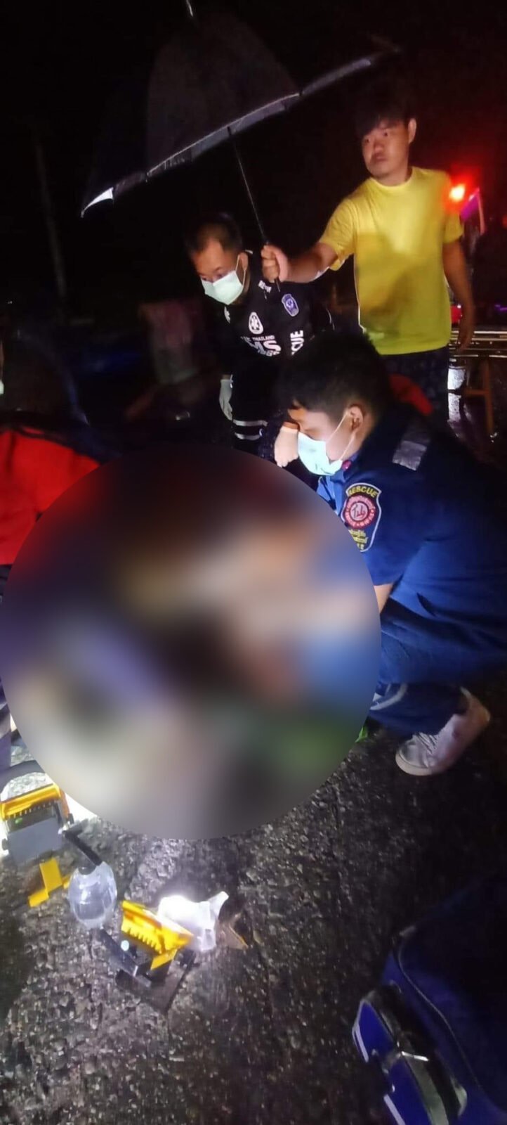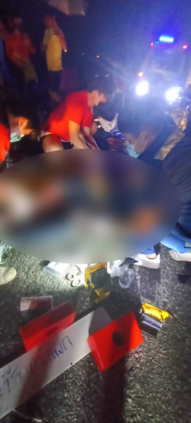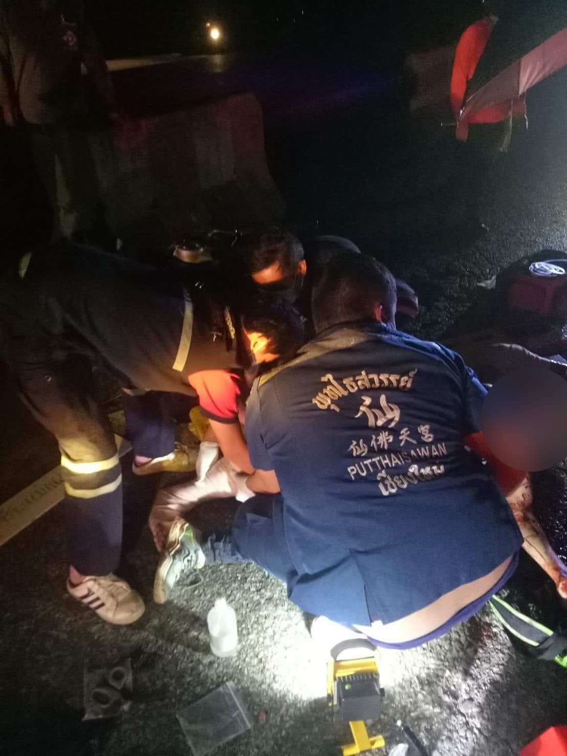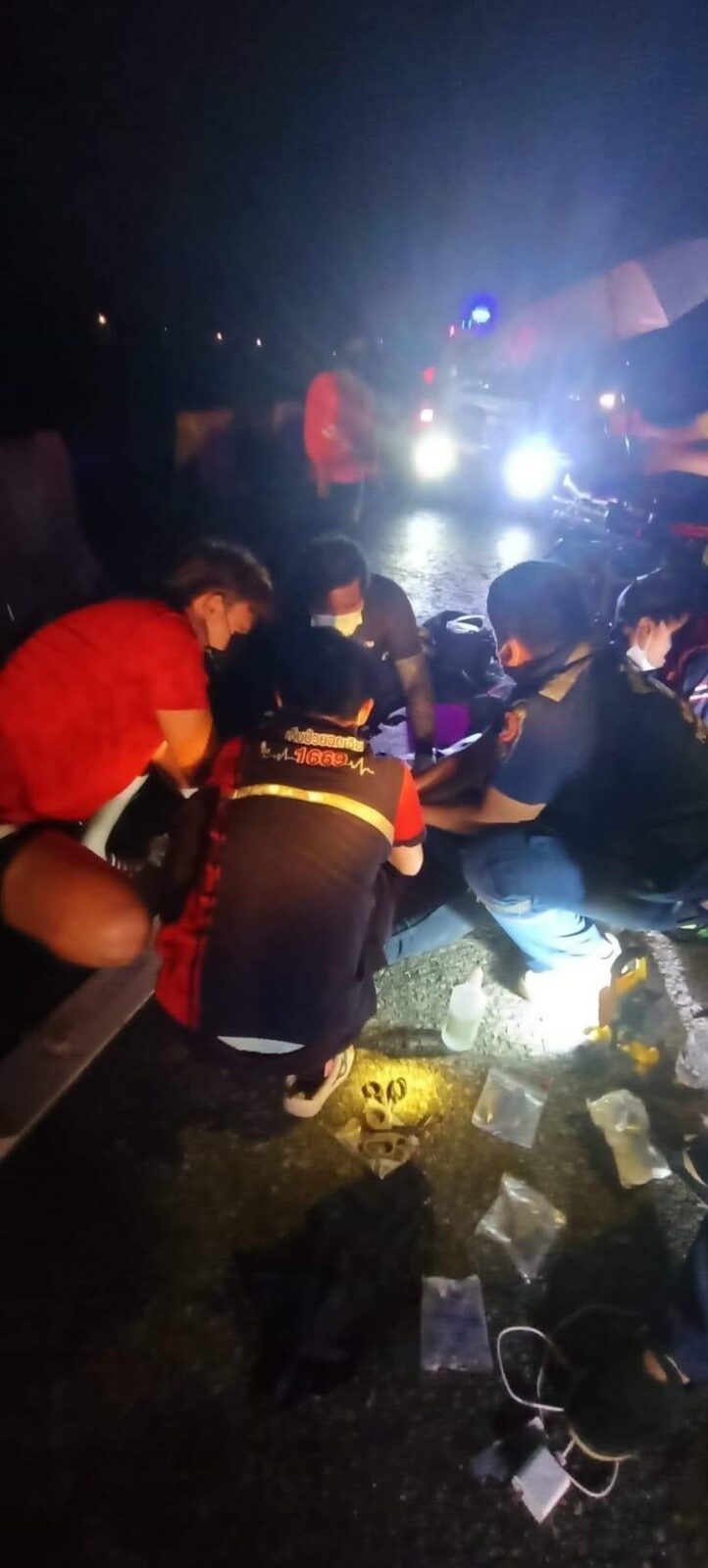 ในที่เกิดเหตุพบชาย 1 ราย นอนสลบเหมือดไม่ได้สติอยู่บนถนน สภาพร่างกายมีบาดแผลฉกรรจ์แขนขวาหักกระดูกโผล่ออกมา ขาขวาหักปากแตกเลือดไหลท่วมตัว ต่อมาทราบชื่อ นายดาวแสง อายุ 22ปี เป็นชาวไทใหญ่ และมีรถ จ.ย.ย.Honda dream 125 สีดำ ป้ายทะเบียน งทข – 328 เชียงใหม่ ล้มอยู่ มีร่องรอยเฉี่ยวชนบริเวณด้านหน้า ห่างจากรถ จ.ย.ย.พบเศษกระจกของรถกระบะสีเทาของรถกระบะตกอยู่ คาดว่าจะเป็นของคู่กรณีที่ได้หลบหนีไป ทางกู้ชีพเเม่เเฝกทำการปฐมพยาบาลนำส่ง รพ.สันทราย เนื่องจากอาการอาการสาหัส เเละได้ส่งตัวรักษาต่อ รพ.นครพิงค์