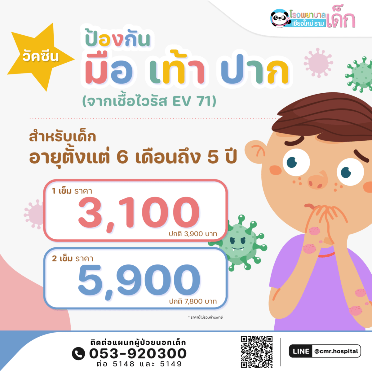 โรงพยาบาลเชียงใหม่ ราม จัดโปรโมชั่น วัคซีนป้องกันโรคมือ เท้า ปาก (จากเชื้อไวรัส EV71) ในราคาสุดพิเศษ เหมาะสำหรับเด็กอายุตั้งแต่ 6 เดือนถึง 5 ปี ควรได้รับวัคซีน 2 เข็ม โดยเว้นระยะห่างจากเข็มแรก 1 เดือน