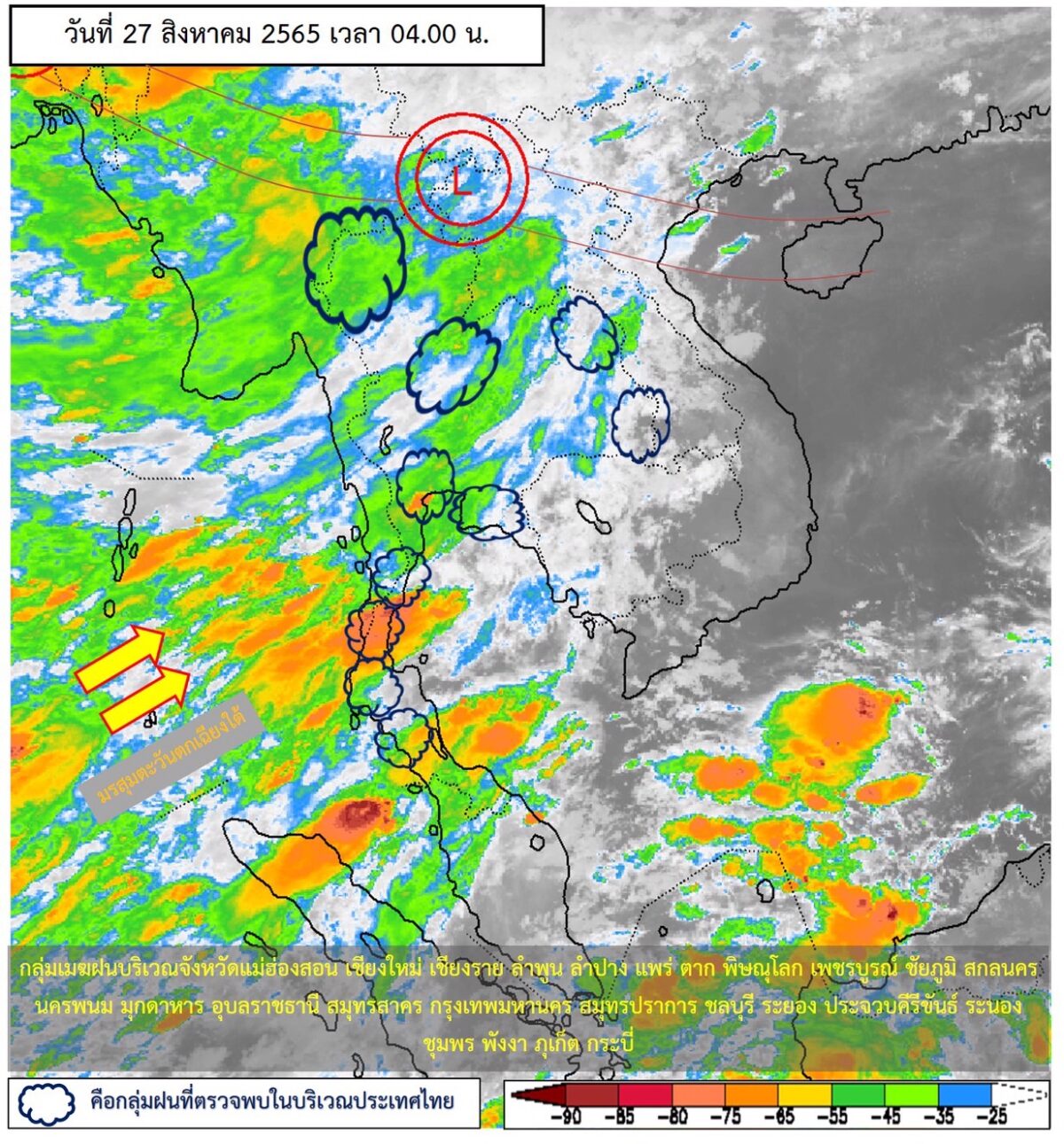 ลักษณะอากาศทั่วไป พยากรณ์อากาศ 24 ชั่วโมงข้างหน้า ร่องมรสุมพาดผ่านตอนบนของภาคเหนือและประเทศลาวตอนบน เข้าสู่หย่อมความกดอากาศต่ำ บริเวณประเทศเมียนมาตอนบน ประกอบกับมรสุมตะวันตกเฉียงใต้กำลังปานกลาง ที่พัดปกคลุมทะเลอันดามัน ประเทศไทย และอ่าวไทย เริ่มมีกำลังอ่อนลง ลักษณะเช่นนี้ทำให้ประเทศไทยตอนบนเริ่มมีฝนลดลง แต่ยังคงมีฝนฟ้าคะนองเกิดขึ้นได้ส่วนมากบริเวณด้านรับมรสุม และมีฝนตกหนักบางแห่ง บริเวณภาคเหนือ ภาคกลาง และภาคใต้ ขอให้ประชาชนในบริเวณดังกล่าว ระวังอันตรายจากฝนตกหนักและฝนที่ตกสะสม ซึ่งอาจทำให้เกิดน้ำท่วมฉับพลันและน้ำป่าไหลหลาก โดยเฉพาะพื้นที่ลาดเชิงเขาใกล้ทางน้ำไหลผ่านและพื้นที่ลุ่มไว้ด้วย