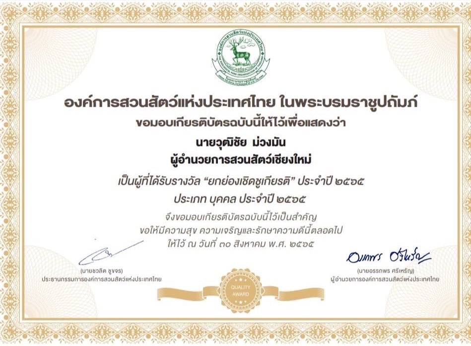 องค์การสวนสัตว์แห่งประเทศไทย มอบรางวัลให้สวนสัตว์เชียงใหม่ ประจำปี 2565