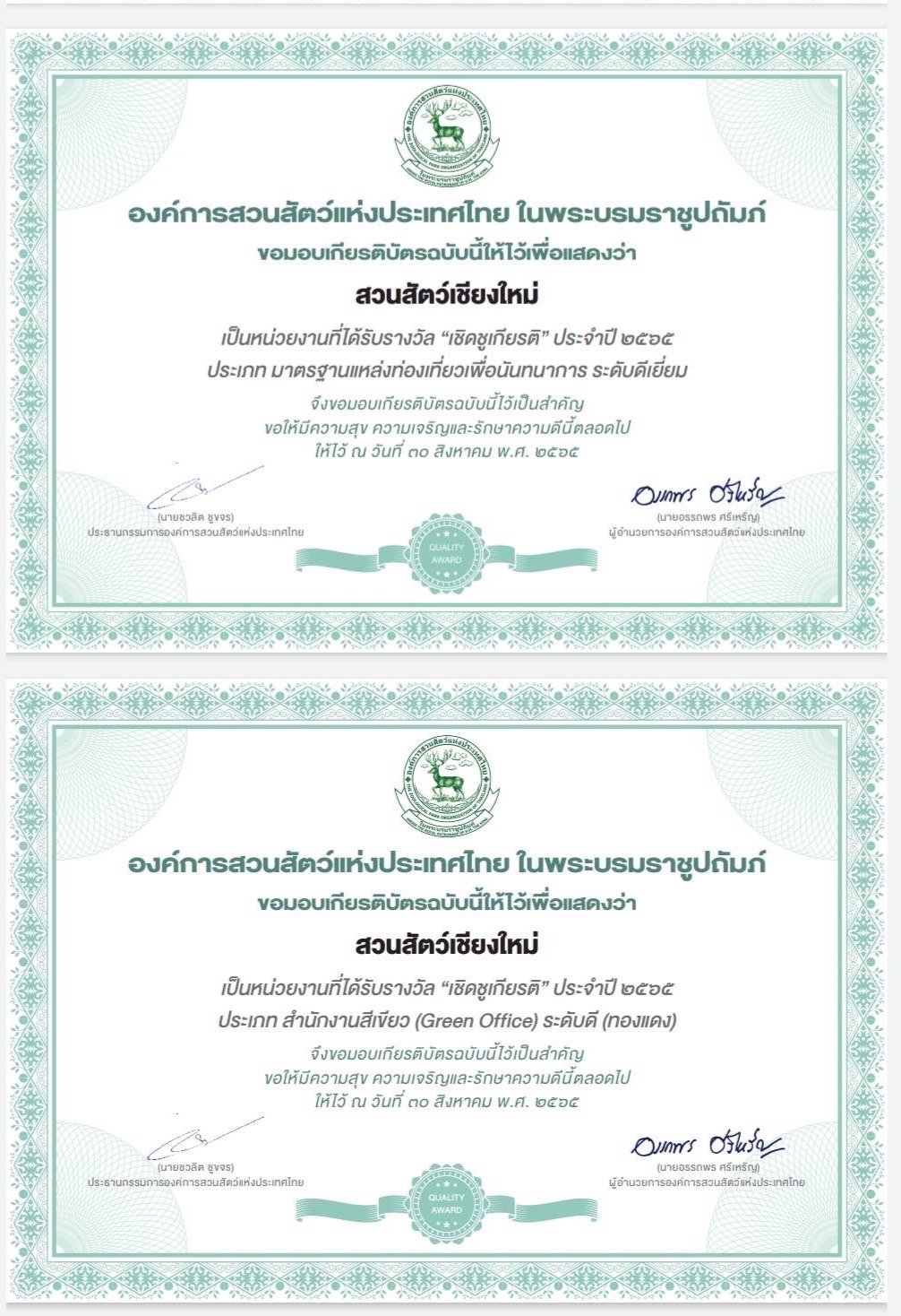2.2. สวนสัตว์เชียงใหม่ เป็นหน่วยงานที่ได้รับรางวัล “เชิดชูเกียรติ” ประจำปี 2565 ประเภท สำนักงานสีเขียว (Green Office) ระดับดี (ทองแดง) จาก กรมส่งเสริมคุณภาพสิ่งแวดล้อม กระทรวงทรัพยากรธรรมชาติและสิ่งแวดล้อม มอบรางวัลสำนักงานสีเขียว Green Office (ระดับทองแดง) การร่วมเข้าร่วมงานโครงการบริหารงานตามหลักธรรมาภิบาล และพิธีมอบรางวัลเชิดชูเกียรติ ในครั้งนี้เป็นการกระตุ้นให้เกิดความเข้าใจในบริบท การเปลี่ยนแปลงขององค์การสวนสัตว์แห่งประเทศไทย ภายใต้นโยบายของคณะกรรมการ องค์การสวนสัตว์แห่งประเทศไทย ที่เล็งเห็นถึงความสำคัญและตระหนักถึงการมีส่วนร่วมในการพัฒนาองค์กร เพื่อให้เกิดความยั่งยืนและเป็นที่ยอมรับในสังคม จัดขึ้นที่องค์การสวนสัตว์แห่งประเทศไทย สำนักงานใหญ่ กรุงเทพมหานคร