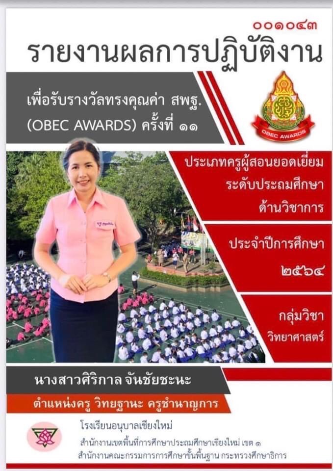 - คุณครูศิริกาล จันชัยชนะ รางวัลชนะเลิศอันดับที่ 1 เหรียญทอง ครูผู้สอนยอดเยี่ยม ระดับประถมศึกษา กลุ่มวิชาวิทยาศาสตร์ ด้านวิชาการ