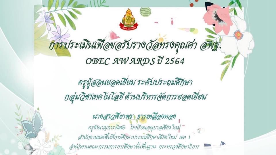 วันที่ 29 สิงหาคม 2565 โรงเรียนอนุบาลเชียงใหม่ ขอแสดงความยินดี กับคณะครูที่ได้รับรางวัลทรงคุณค่า สพฐ.OBEC AWARDS ภาคเหนือ เพื่อเป็นตัวแทนภาคเหนือเข้าร่วมประกวดในระดับประเทศ