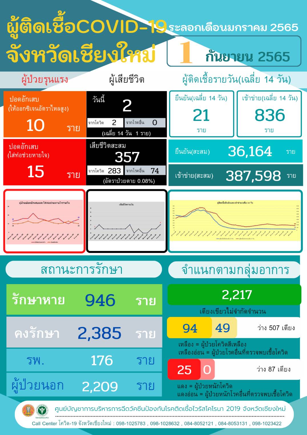 สาธารณสุข จ.เชียงใหม่ เผยสถานการณ์ COVID-19 ในพื้นที่ พบผู้ป่วย Covid-19 ยืนยันเพิ่ม 21 ราย สะสม 36,164 ราย มีผู้เสียชีวิตเพิ่ม 2 ราย สะสม 357 ราย เข้าข่ายติดเชื้อสะสม 387,598 ราย รักษาตัวอยู่ 2,385 ราย รักษาหายวันนี้ 946 ราย เมื่อวันที่ 1 ก.ย. 2565 (13.00 น.)