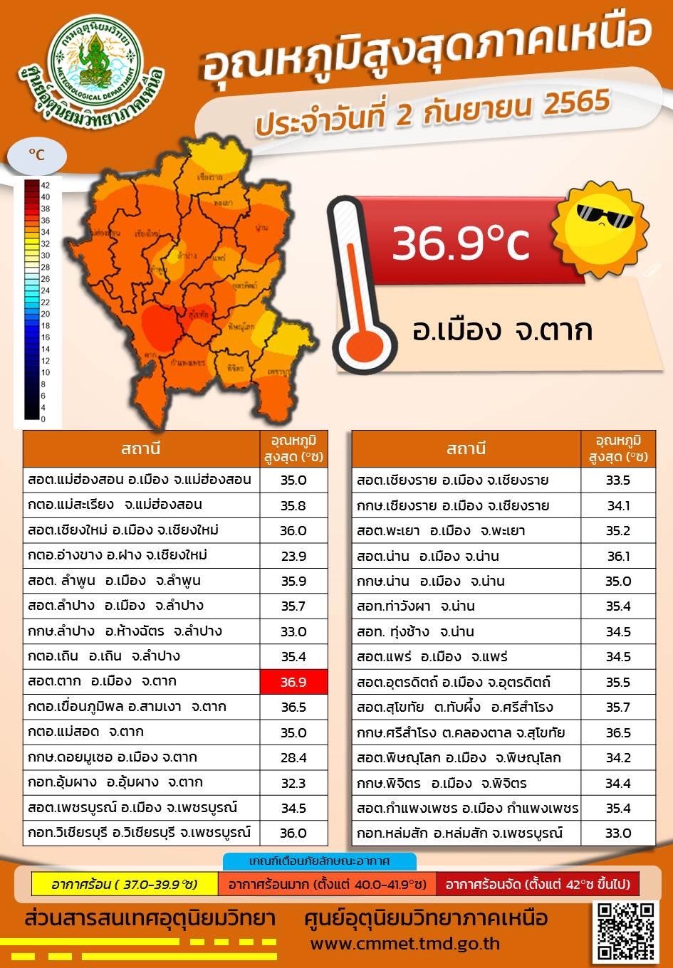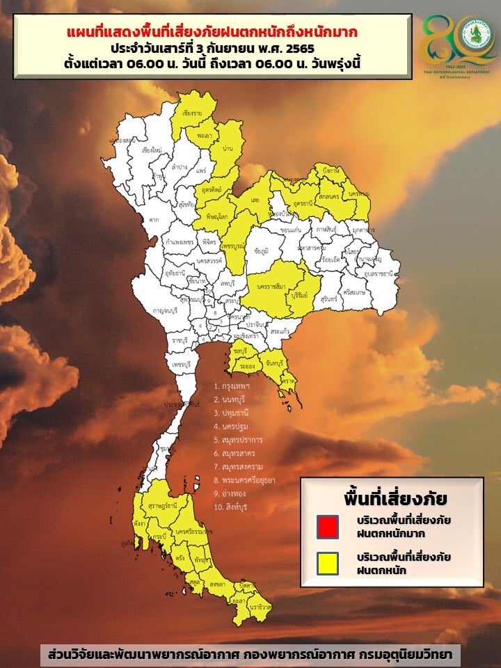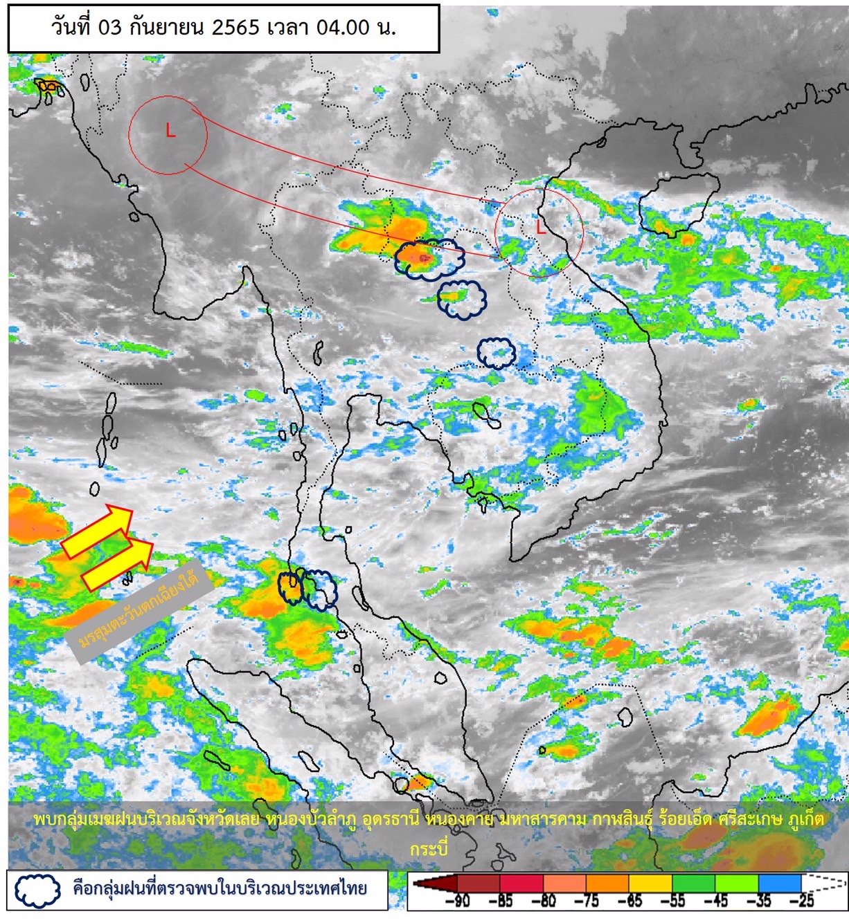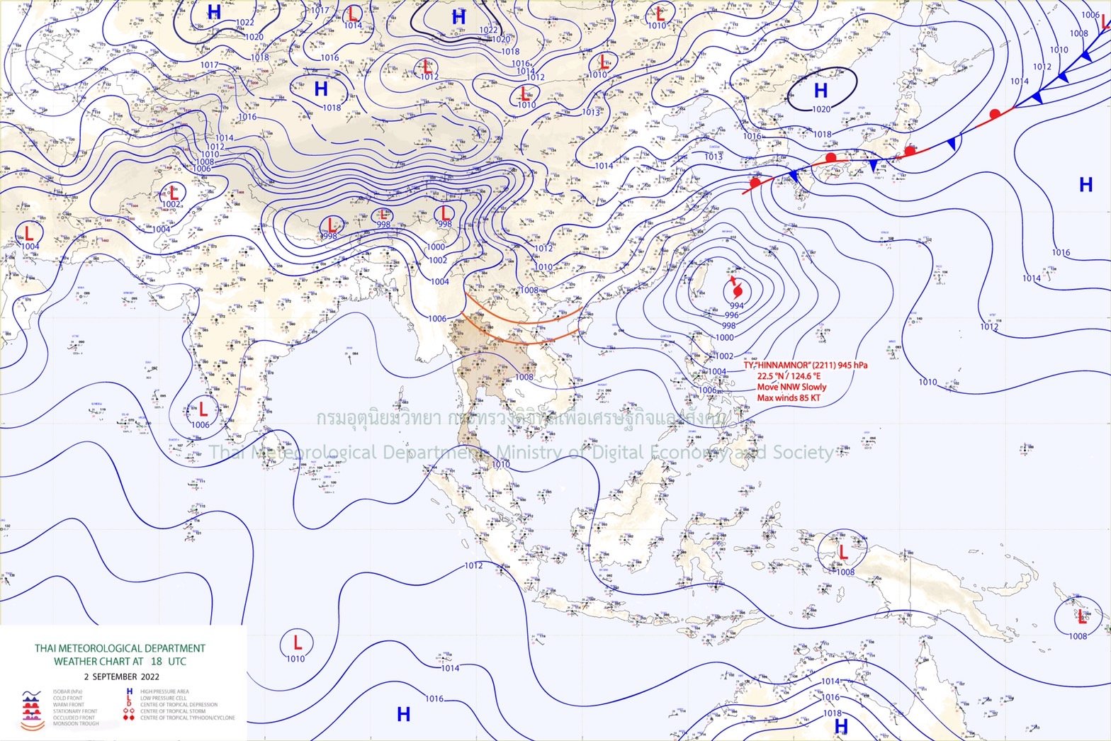 อนึ่ง ในช่วงวันที่ 5-9 ก.ย. 65 ร่องมรสุมกำลังแรงจะเลื่อนลงมาพาดผ่านภาคเหนือตอนล่าง ภาคกลางตอนบน และภาคตะวันออกเฉียงเหนือ ประกอบกับมรสุมตะวันตกเฉียงใต้ ที่พัดปกคลุมทะเลอันดามัน ภาคใต้ และอ่าวไทยจะมีกำลังแรงขึ้น ลักษณะเช่นนี้ทำให้ประเทศไทย มีฝนเพิ่มขึ้นและมีฝนตกหนักถึงหนักมากบางแห่ง สำหรับคลื่นลมบริเวณทะเลอันดามันตอนบน และอ่าวไทยตอนบนมีกำลังค่อนข้างแรง โดยมีคลื่นสูง 2-3 เมตร บริเวณที่มีฝนฟ้าคะนองคลื่นสูงมากกว่า 3 เมตร