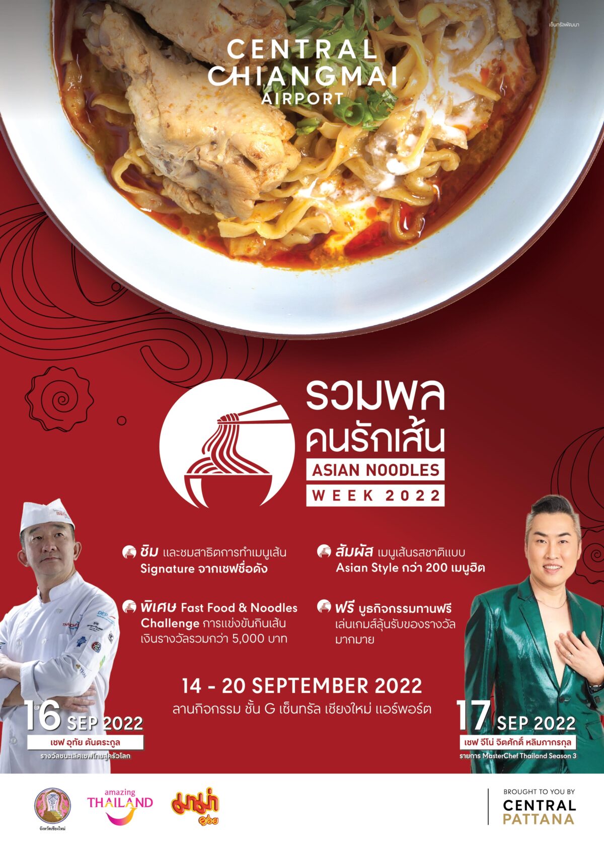 14-20 ก.ย. 65 ลานกิจกรรมชั้น G ศูนย์การค้าเซ็นทรัล เชียงใหม่ แอร์พอร์ต ร่วมกับจังหวัดเชียงใหม่ และการท่องเที่ยวแห่งประเทศไทย (ททท.) สำนักงานจังหวัดเชียงใหม่ จัดงาน “รวมพลคนรักเส้น : Asian Noodles Week 2022” งานที่คนรักเมนูเส้นไม่ควรพลาด สัมผัสเมนูเส้นรสชาติแบบ Asian Style กว่า 200 เมนูฮิต ชิม และชมสาธิตการทำเมนูเส้น Signature จากเชฟดัง พิเศษ! การแข่งขันกินเส้น “Fast Food & Noodles Challenge” เงินรางวัลรวมกว่า 5,000