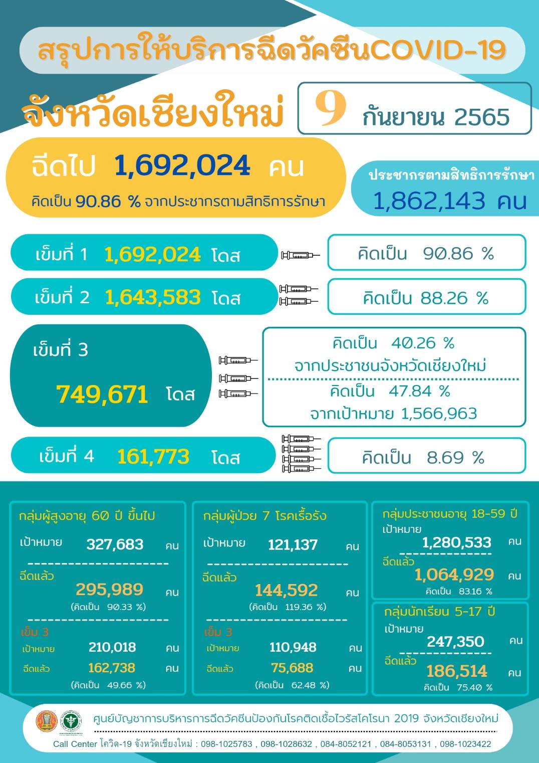 สาธารณสุข จ.เชียงใหม่ เผยสถานการณ์ COVID-19 ในพื้นที่ พบผู้ป่วย Covid-19 ยืนยันเพิ่ม 15 ราย สะสม 36,273 ราย มีผู้เสียชีวิตเพิ่ม 1 ราย สะสม 367 ราย เข้าข่ายติดเชื้อสะสม 392,858 ราย รักษาตัวอยู่ 2,117 ราย รักษาหายวันนี้ 702 ราย เมื่อวันที่ 9 ก.ย. 2565 (13.00 น.)