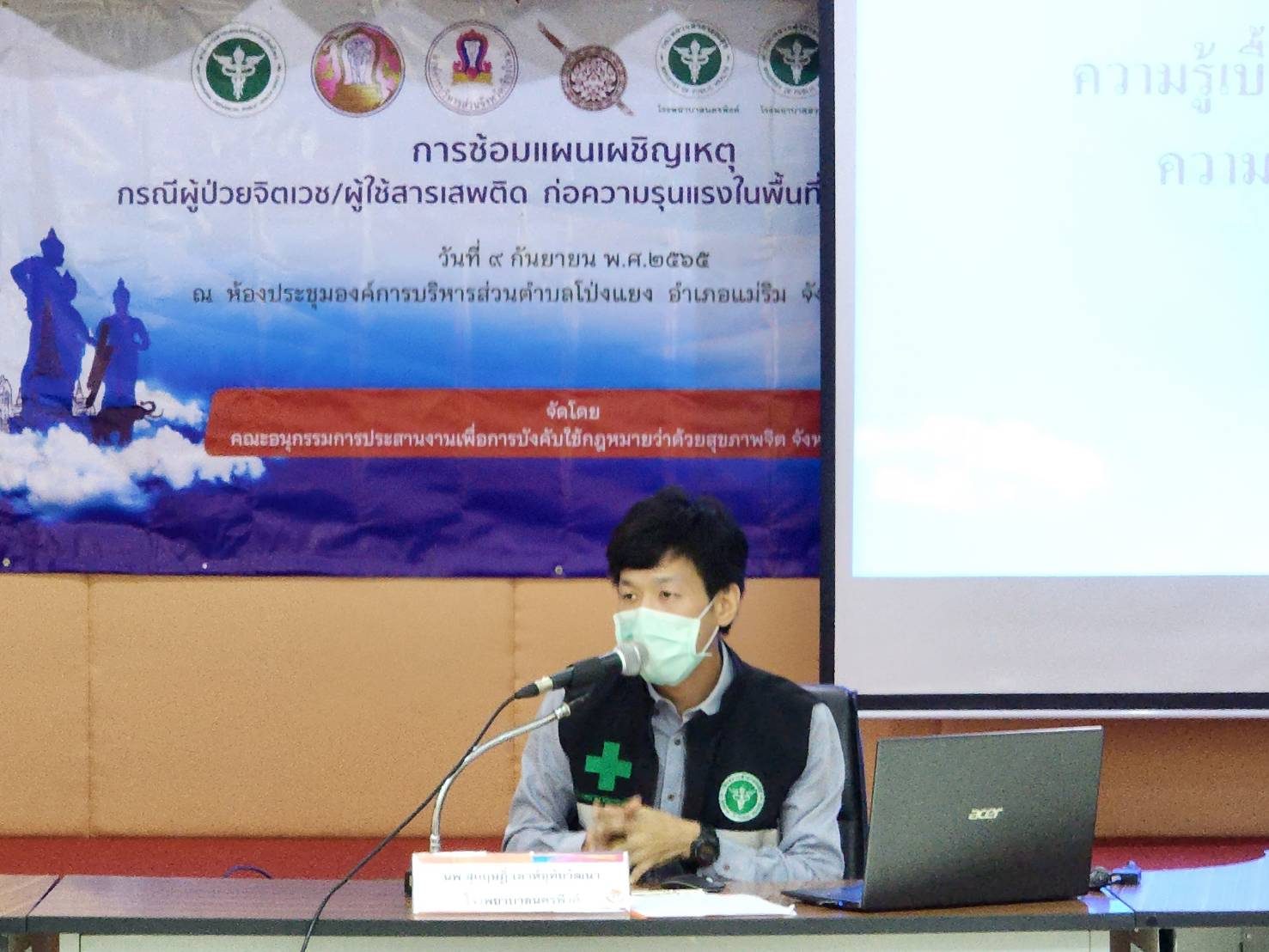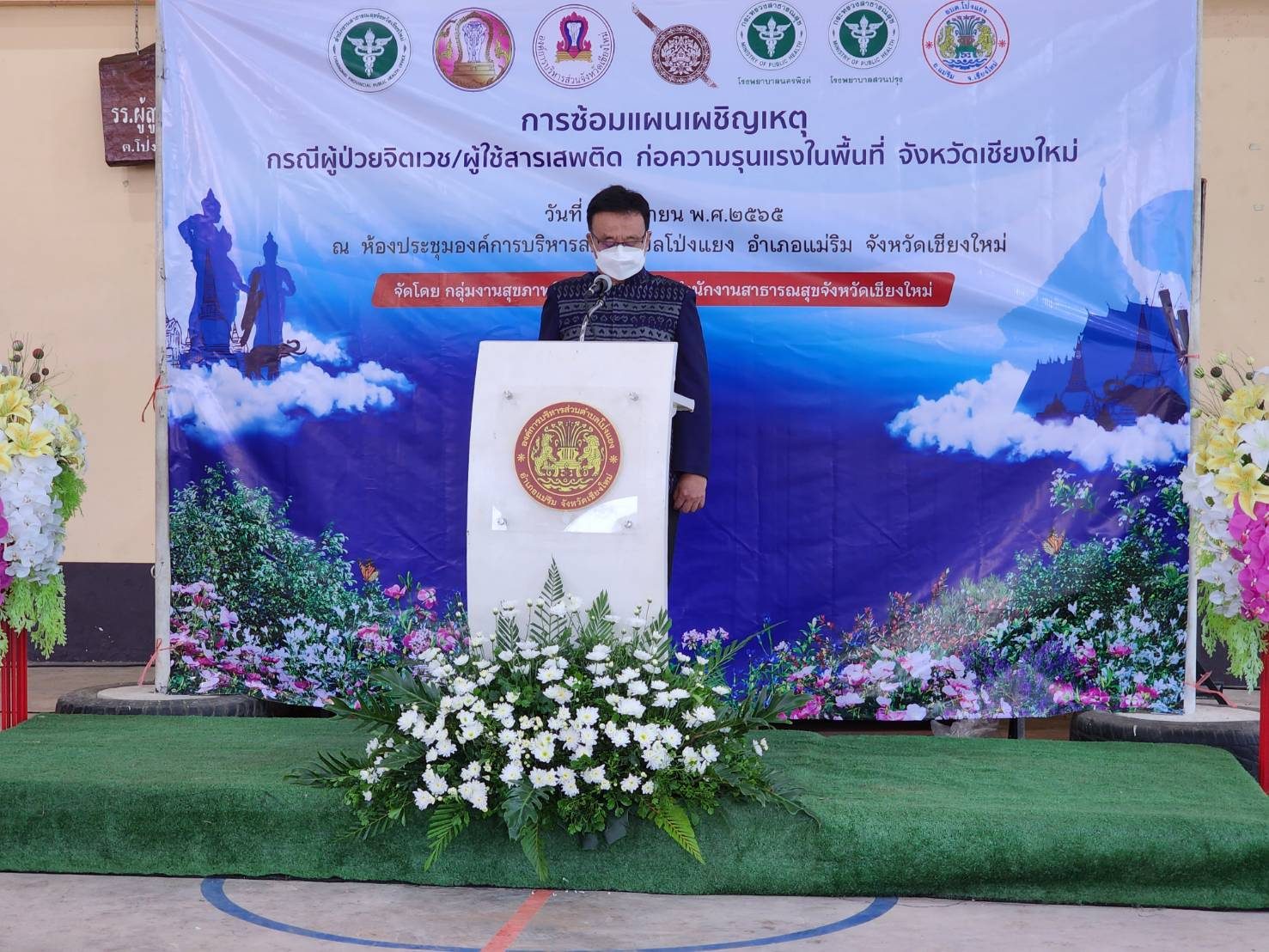 วันที่ 9 กันยายน 2565 นายศักดิ์ชัย คุณานุวัฒน์ชัยเดช รองผู้ว่าราชการจังหวัดเชียงใหม่ ให้เกียรติเป็นประธานเปิดการซ้อมแผนเผชิญเหตุ กรณีผู้ป่วยจิตเวช/ผู้ใช้สารเสพติด ก่อความรุนแรงในพื้นที่ จ.เชียงใหม่ ณ องค์การบริหารส่วนตำบลโป่งแยง อำเภอแม่ริม จังหวัดเชียงใหม่ โดยมีนายแพทย์อภิชาติ ดำรงไชย รองผู้อำนวยการด้านสนับสนุนและพัฒนาเครือข่ายบริการ โรงพยาบาลสวนปรุง จังหวัดเชียงใหม่ เป็นผู้กล่าวรายงาน