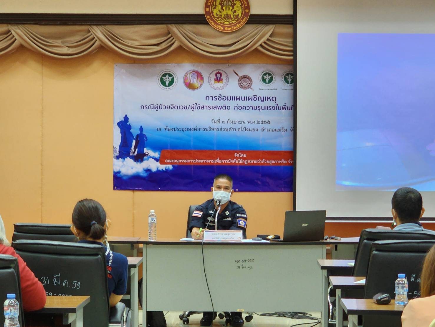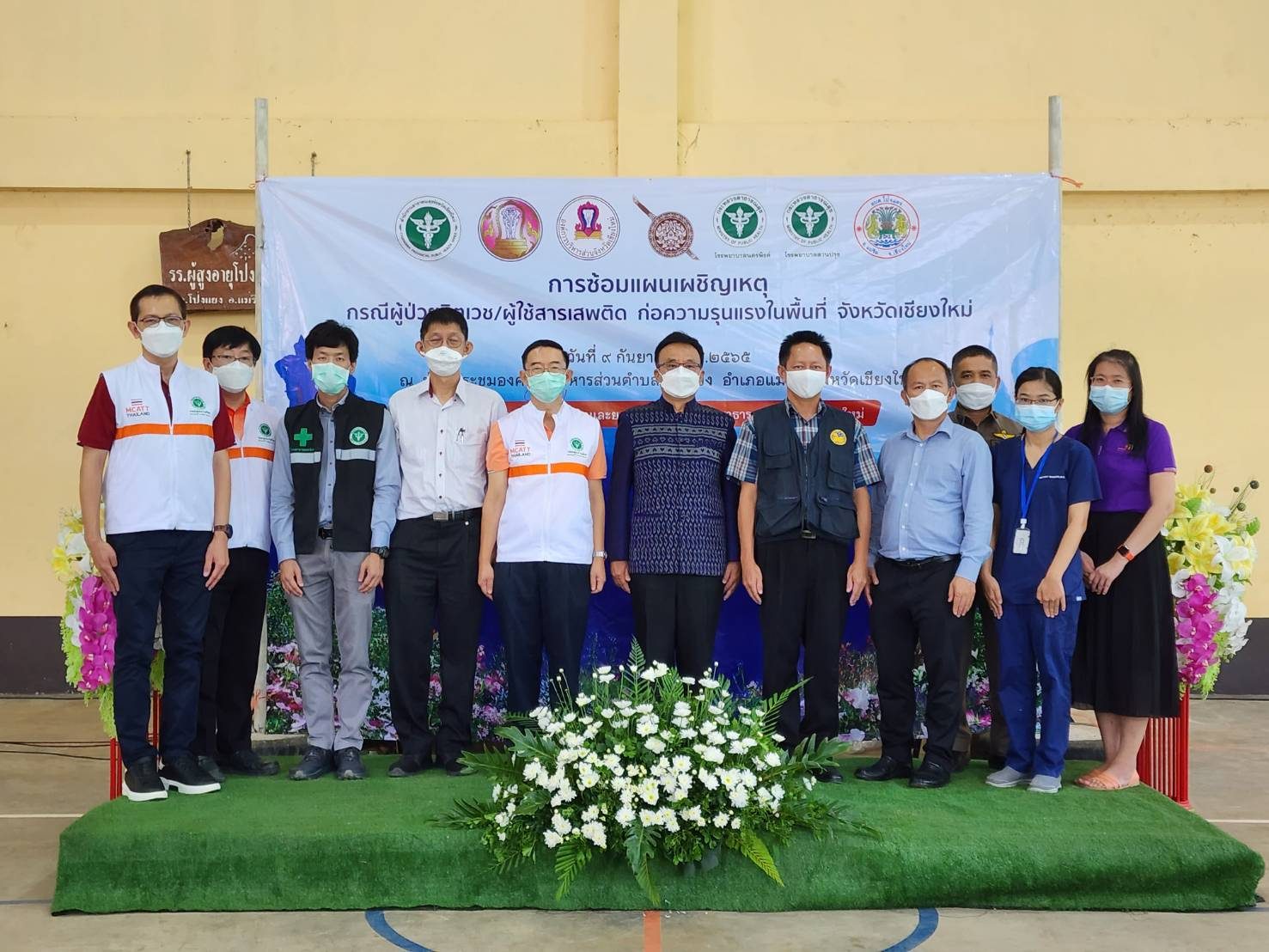 ผู้นำชุมชน หรือโทร 191 หรือ 1669 เพื่อเข้าระงับเหตุ คณะอนุกรรมการประสานงานเพื่อการบังคับใช้กฎหมายว่าด้วยสุขภาพจิต จังหวัดเชียงใหม่ จึงมีมติในการประชุมครั้งที่ 1/2565 เมื่อวันที่ 10 มิถุนายน 2565 ให้ดำเนินการซ้อมแผนเผชิญเหตุ กรณีผู้ป่วยจิตเวชผู้ใช้สารเสพติด ก่อความรุนแรง ในพื้นที่ โดยมีวัตถุประสงค์เพื่อพัฒนาระบบการดูแลผู้ป่วยจิตเวชที่มีความเสี่ยงสูงต่อการก่อความรุนแรง ให้สามารถดูแล ช่วยเหลือผู้ป่วยได้อย่างรวดเร็ว มีประสิทธิภาพ ไม่เกิดความสูญเสียต่อร่างกายและทรัพย์สิน