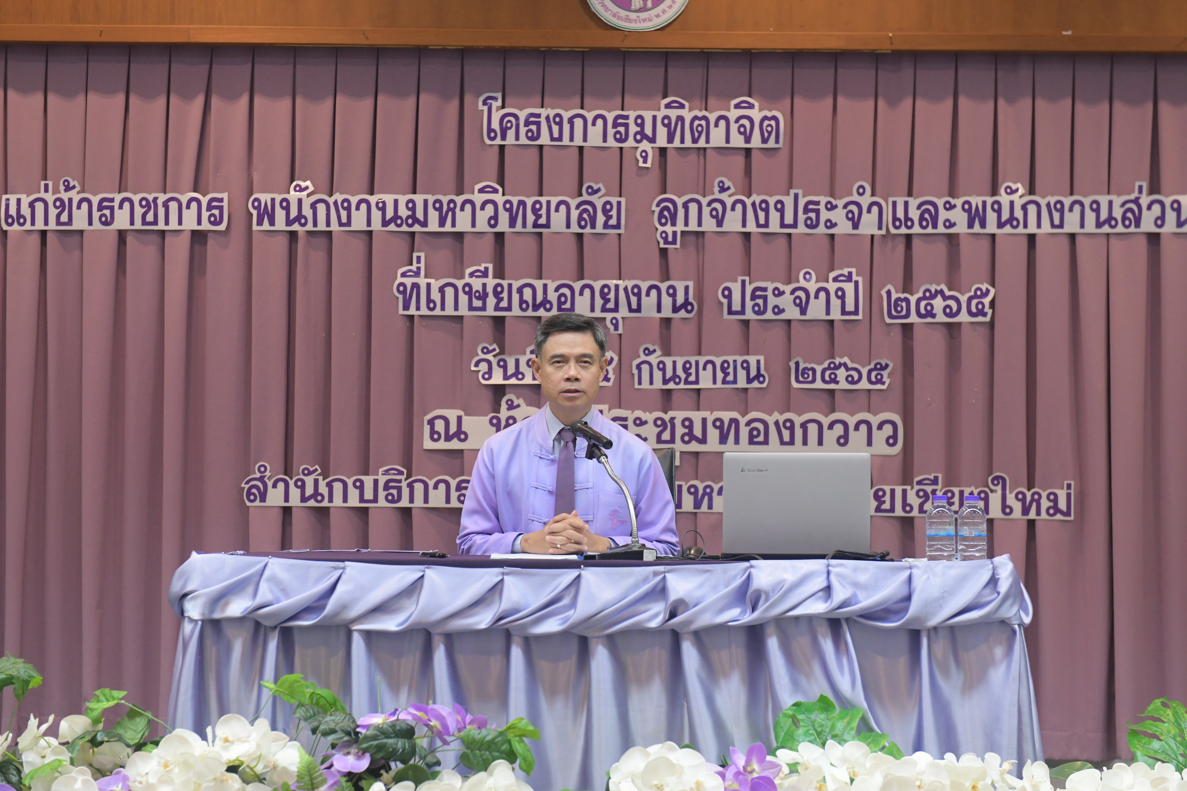 มหาวิทยาลัยเชียงใหม่ จัดโครงการมุทิตาจิต ข้าราชการ พนักงานมหาวิทยาลัย และลูกจ้างประจำ ที่เกษียณอายุงาน ประจำปี 2565 เพื่อแลกเปลี่ยนเรียนรู้เกี่ยวกับ สิทธิและสวัสดิการต่างๆ ตลอดจนการประพฤติปฏิบัติตนในการดูแลรักษาสุขภาพร่างกายในช่วงหลังวัยเกษียณ โดยมี ศ.ดร.นพ.พงษ์รักษ์ ศรีบัณฑิตมงคล อธิการบดีมหาวิทยาลัยเชียงใหม่ กล่าวเปิดโครงการ และได้รับเกียรติจาก ศ.คลินิก นพ.นิเวศน์ นันทจิต อดีตอธิการบดีมหาวิทยาลัยเชียงใหม่ บรรยายพิเศษ เรื่อง “ชีวิตหลังเกษียณ สุขภาพและข้อควรระวัง ในวัย 60 ปี” พร้อมวิทยากรผู้มีประสบการณ์หลายท่าน ที่ได้มาให้ความรู้และการดูแลสุขภาพ ด้านการเงินและภาษี และกฎหมายมรดกและกฎหมายอื่นๆ ณ ห้องทองกวาว สำนักบริการวิชาการ มหาวิทยาลัยเชียงใหม่ เมื่อวันพฤหัสบดีที่ 15 กันยายน พ.ศ. 2565