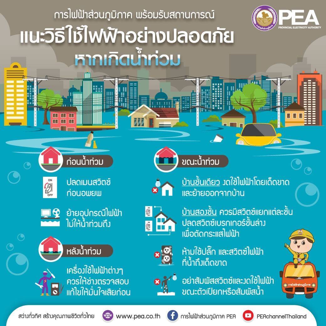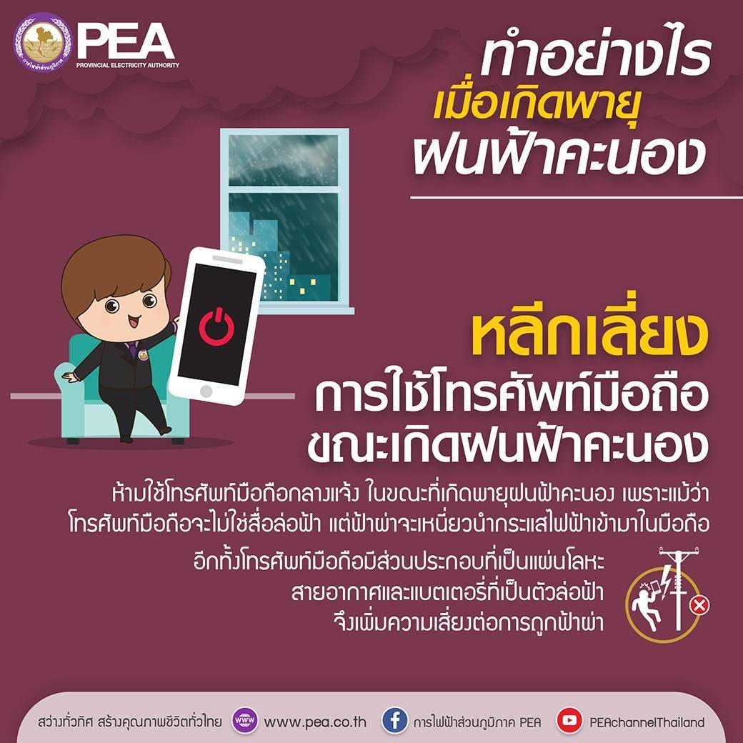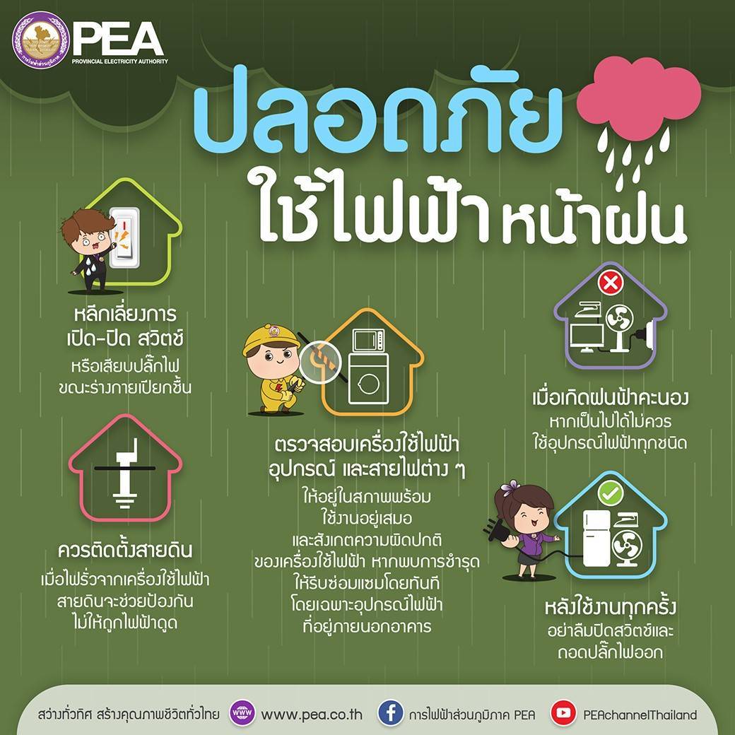 ดังนี้ 1. เมื่อเกิดฝนฟ้าคะนอง ไม่ควรใช้อุปกรณ์ไฟฟ้าทุกชนิด และถ้าเครื่องใช้ไฟฟ้าเปียกน้ำ เมื่อจะนำไปใช้งานควรเช็ด หรือผึ่งให้แห้งก่อน เพื่อป้องกันไม่ให้กระแสไฟฟ้าลัดวงจรภายในเครื่องใช้ไฟฟ้า 2. เมื่อร่างกายเปียกชื้น ห้ามแตะต้องส่วนที่มีกระแสไฟฟ้าเพราะอาจเกิดกระแสไฟฟ้ารั่ว เพราะความต้านทานของผิวหนังที่เปียกชื้นจะลดลงมาก ทำให้กระแสไฟฟ้าไหลผ่านร่างกายได้โดยสะดวก เกิดกระแสไฟฟ้าดูดอาจถึงแก่ชีวิตได้ 3. ควรติดตั้งสายดินป้องกันไฟฟ้ารั่ว และหากจำเป็นต้องใช้ไฟฟ้าในขณะที่ร่างกายเปียกชื้น เช่น การใช้เครื่องทำน้ำอุ่น นอกจากติดตั้งสายดินแล้ว ยังต้องติดตั้งเครื่องตัดไฟฟ้ารั่ว เพื่อเสริมการทำงานของสายดินให้ปลอดภัยยิ่งขึ้นด้วย 4. ตรวจสอบต้นไม้ที่อยู่ใกล้แนวสายไฟฟ้าหากมีกิ่งไม้อยู่ใกล้เกินไปหรือคาดว่าเมื่อมีลมพัดแรง อาจทำให้กิ่งไม้เอนไปแตะสายไฟฟ้า หรือต้นไม้หักโค่นล้มทับสายไฟฟ้า ให้แจ้ง PEA ในพื้นที่ทราบเพื่อดำเนินการแก้ไข 5. ให้ความร่วมมือในการตัดต้นไม้หรือตัดกิ่งไม้ที่กีดขวางแนวเสาไฟฟ้า สายไฟฟ้าและจุดปักเสาไฟฟ้า 6. หากพบกิ่งไม้ที่หักโค่นทับหรือพาดสายไฟฟ้าแรงสูง อย่าเข้าใกล้เพราะอาจมีกระแสไฟฟ้ารั่ว ควรรีบแจ้ง PEA ในพื้นที่ทราบ เพื่อดำเนินการแก้ไข